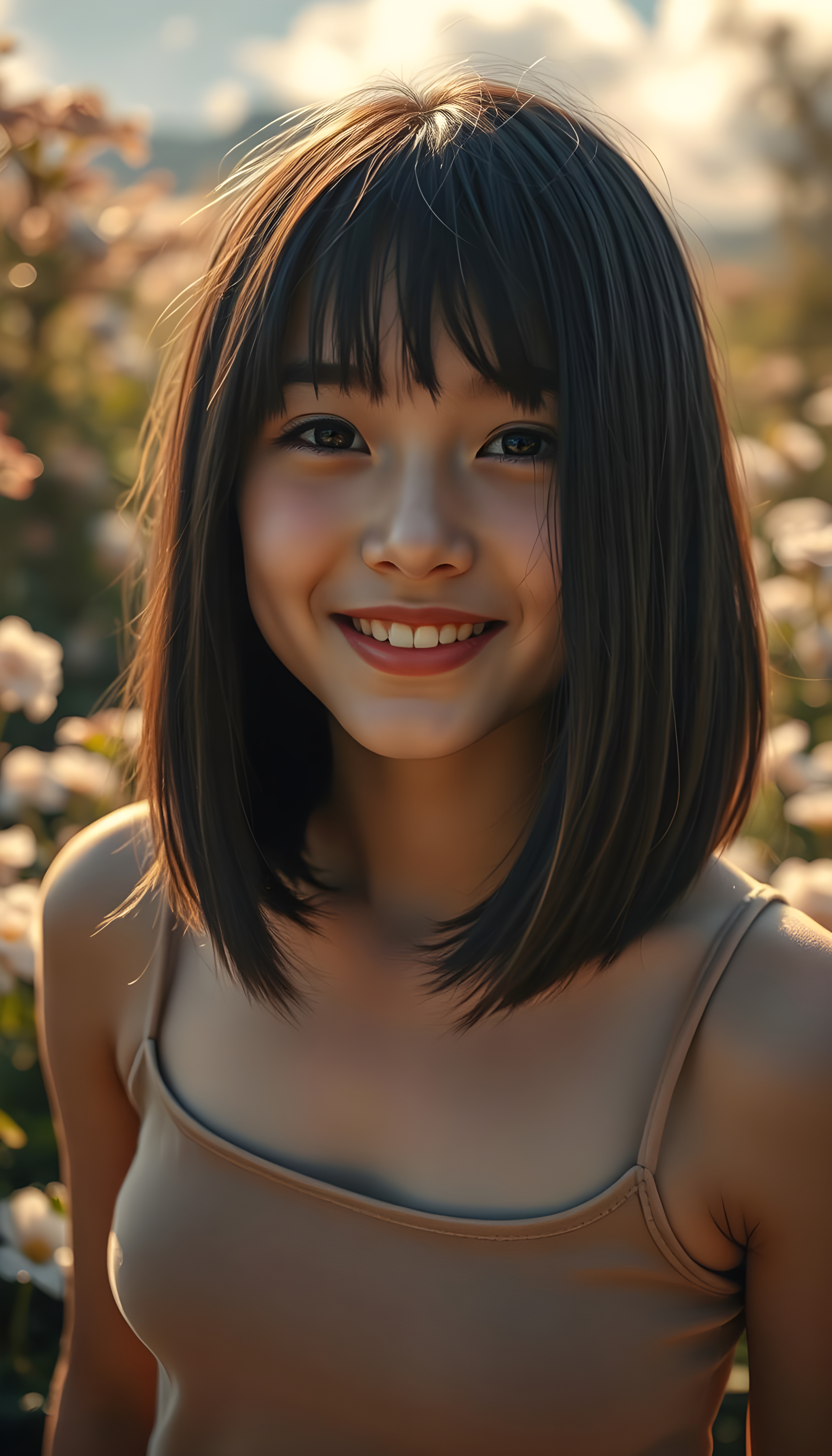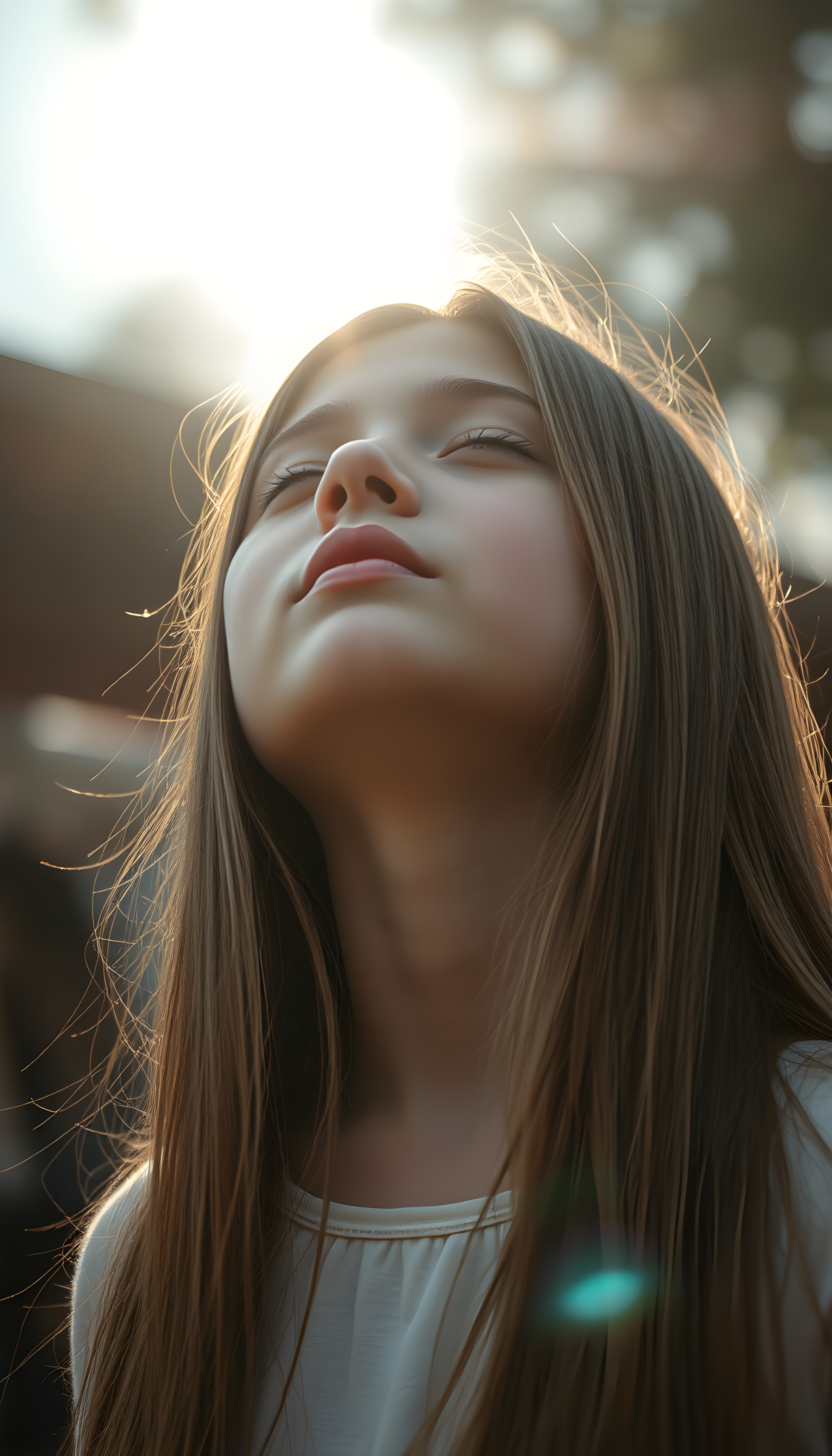 a young girl, looks up, closed eyes, long straight hair falls down to her back, the sun kiss her round face, open mouth