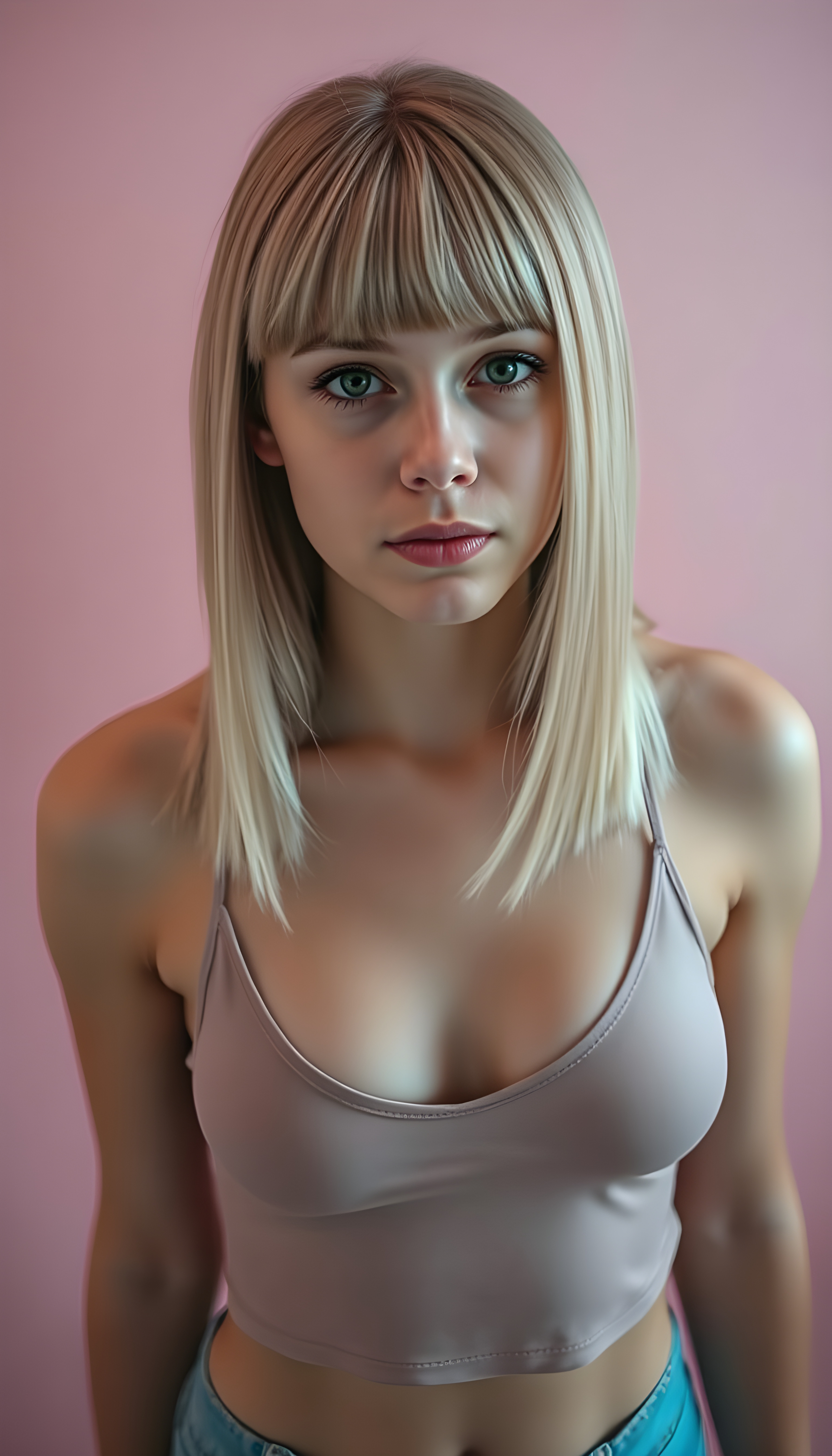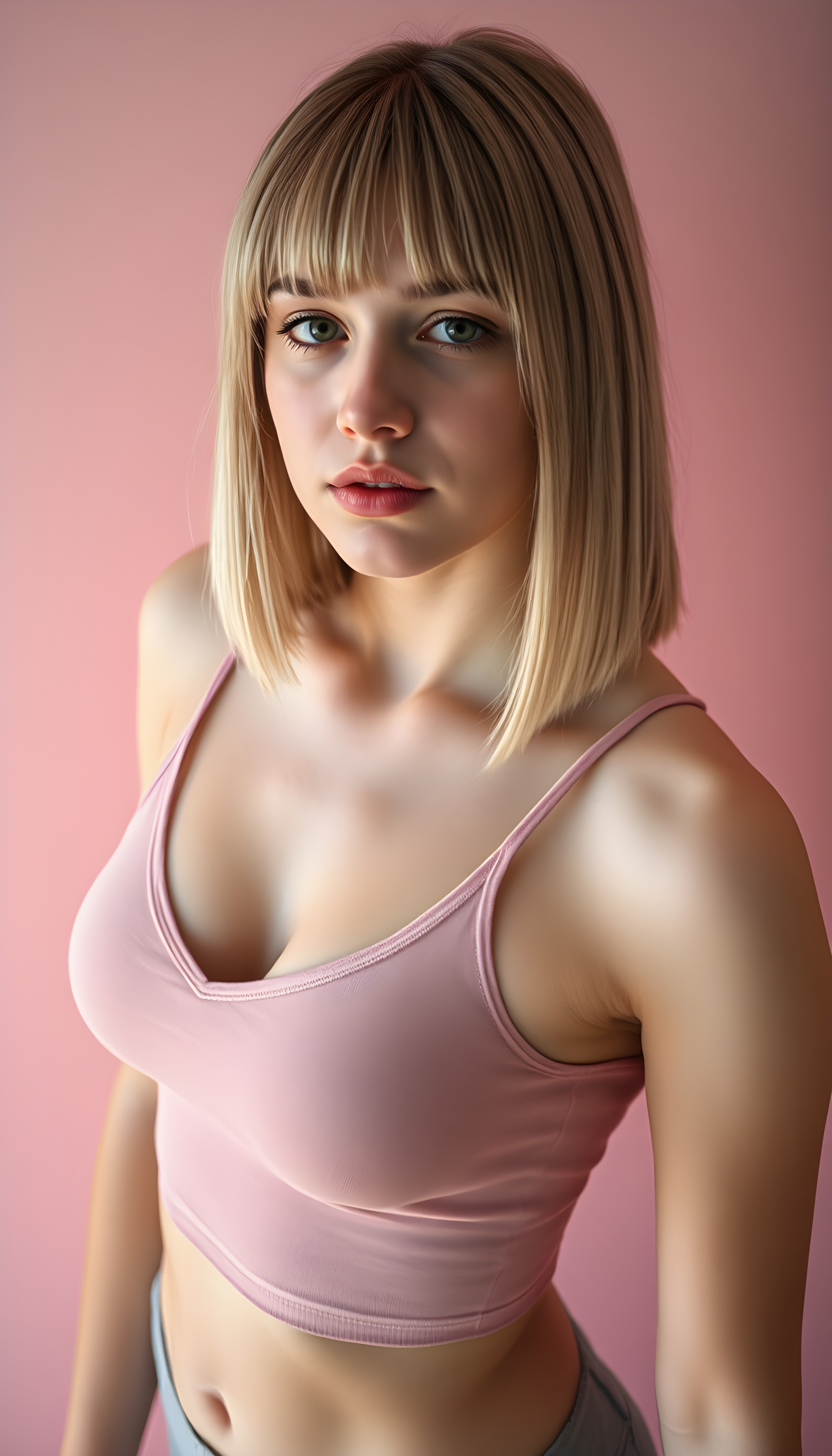 A young well busty teen girl with striking, straight shoulder-long blonde hair framing her face, bob cut, her bangs styled in a perfect side part, exuding confidence with a curvy silhouette, poses confidently against a soft, pastel pink backdrop. She is dressed in a modern, minimalist style thin cropped light grey tank top, deep v-neck, perfect female curved body. The lighting is soft and ethereal, highlighting her features and adding a dreamy atmosphere to the scene, ((view from above))