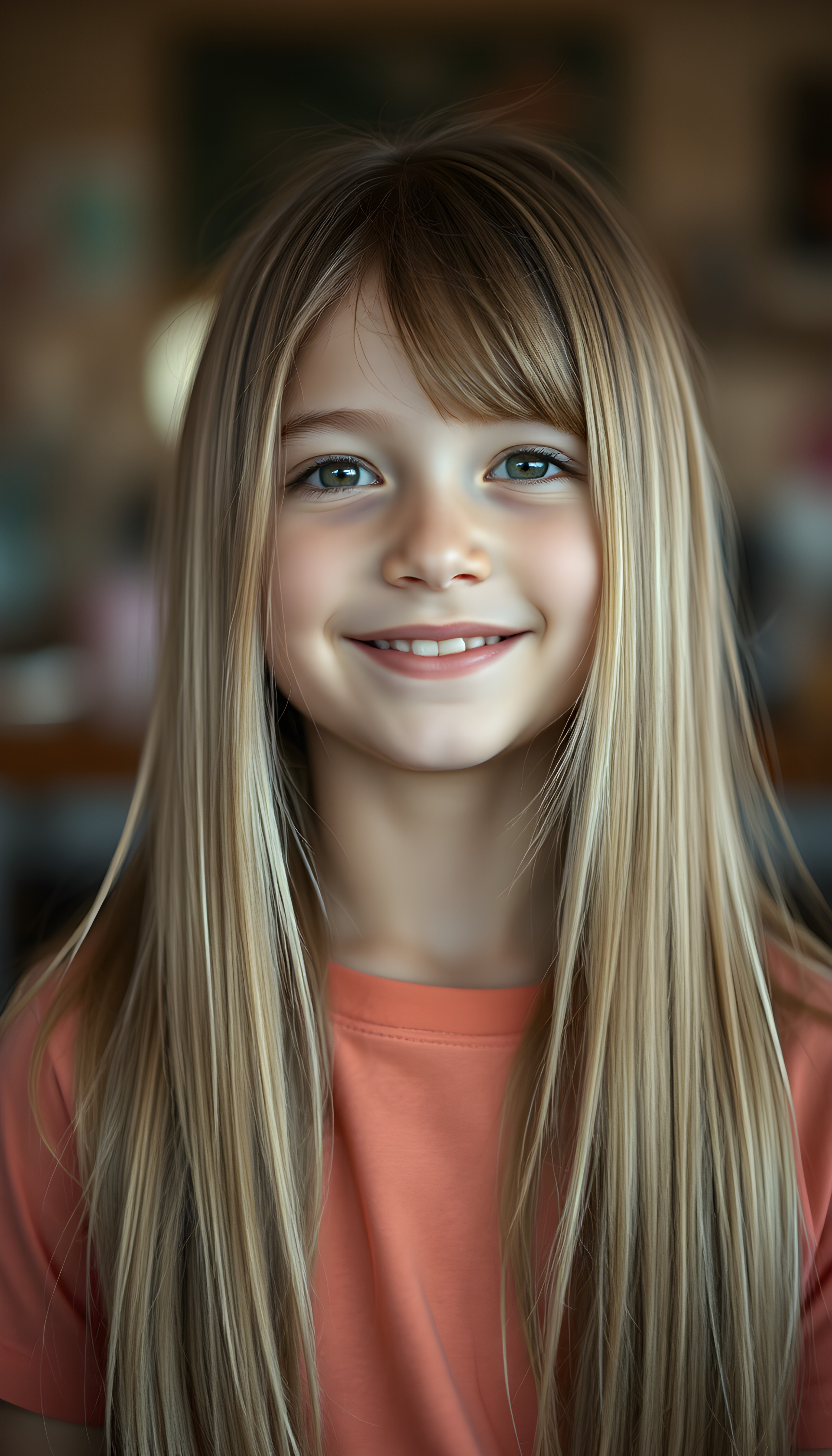 a young girl, long straight detailed blond hair with brown highlights falls down to her back, round face. She is very happy. She wears a colored t-shirt.