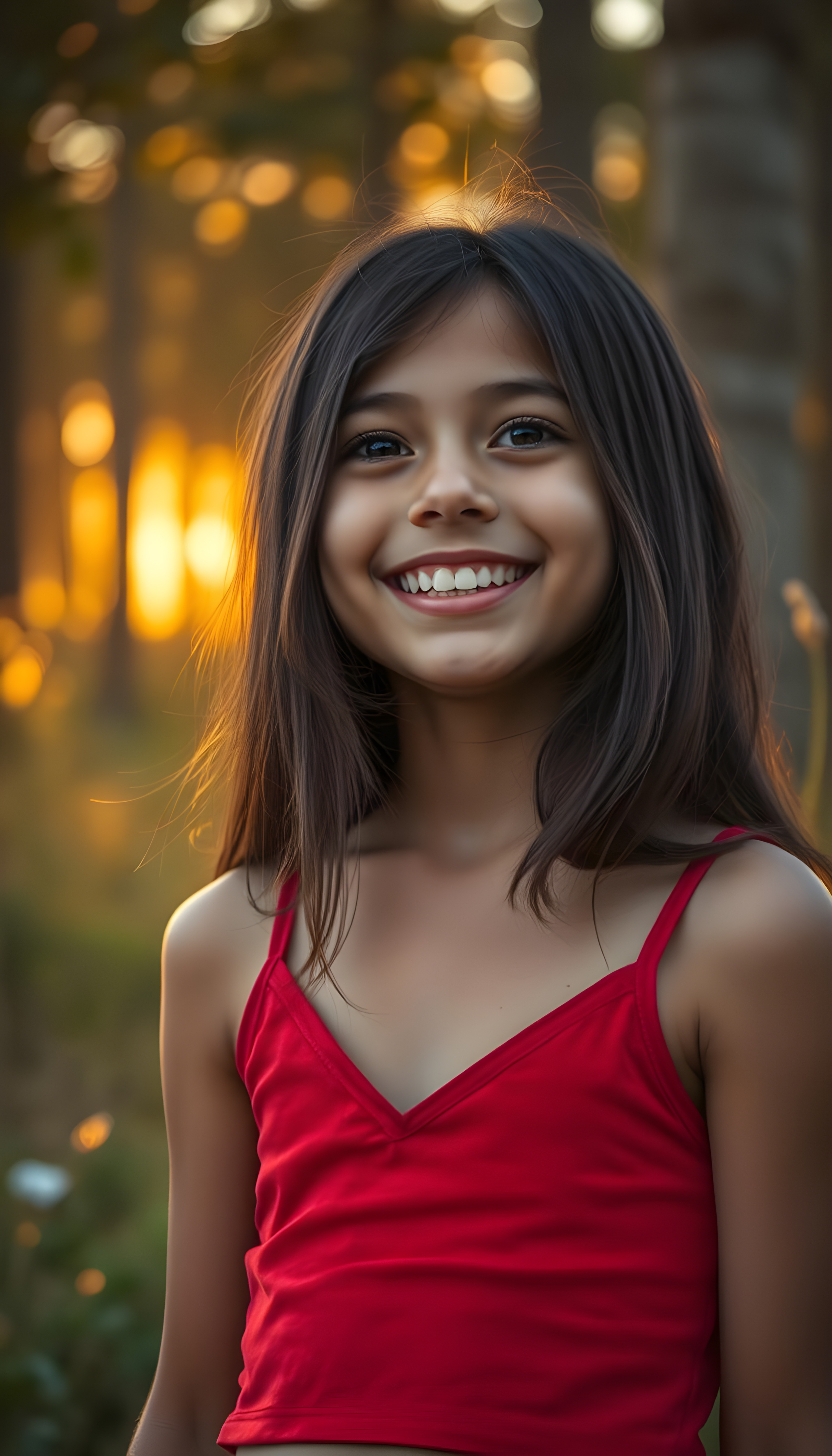 A young Latina girl with long, flowing dark brown hair, styled in a soft bob, stands with a radiant smile, her eyes shimmering with curiosity. Her lips are slightly parted, revealing perfectly white teeth, as if she’s about to share a secret. She’s dressed in a vibrant red, cropped tank top with a deep V-neck, set against a backdrop of soft, warm sunset hues. The lighting is golden, casting a gentle glow that highlights her youthful innocence and beauty. She’s surrounded by a whimsical, magical forest with glowing fireflies and tall, lush trees, creating a dreamlike atmosphere. Her expression is one of joy and anticipation, as if she’s waiting for a friend to join her in this enchanted scene.