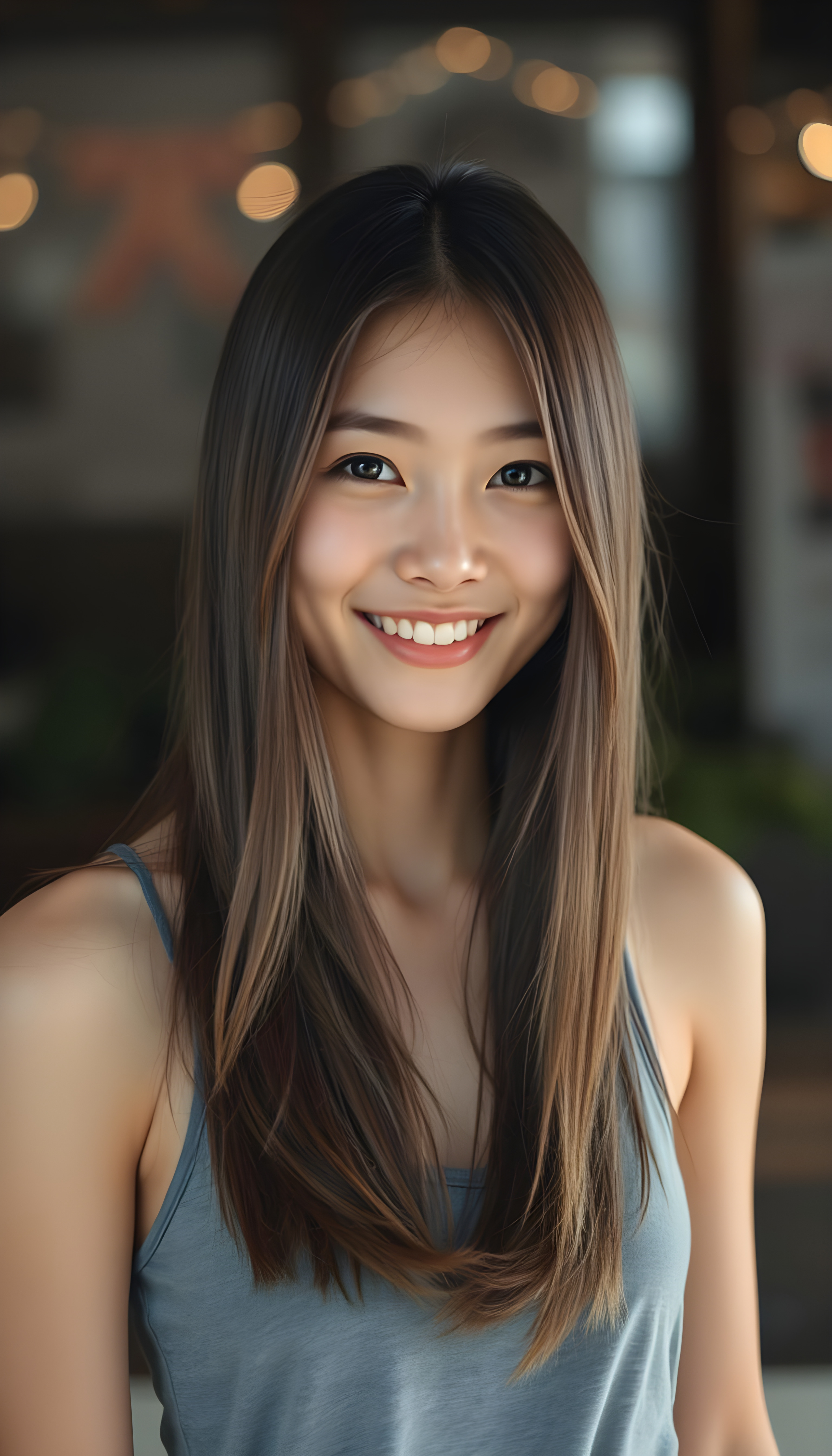a very nice young Japanese girl, portrait shot, her long hazelnut hair falls over her shoulders, warm smile, she wears a grey tank top, perfect curved body