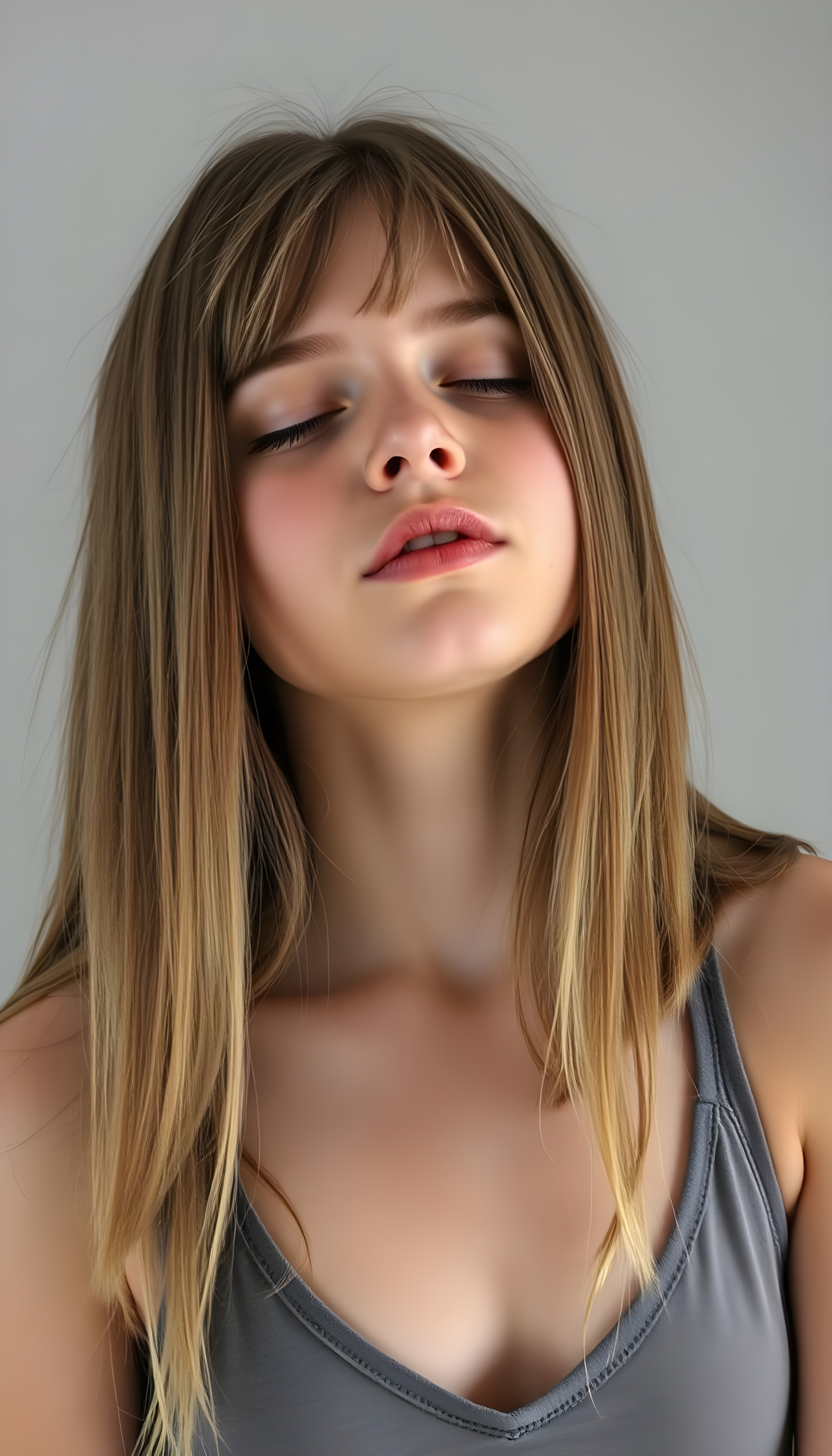 a young, innocent teen girl with shoulder long straight amber hair, closed eyes, round face, full kissable lips, mouth slightly open, white teeth, light grey backdrop, she expects a passionate kiss, head slightly up, she wears a cropped short tank top, deep v-neck
