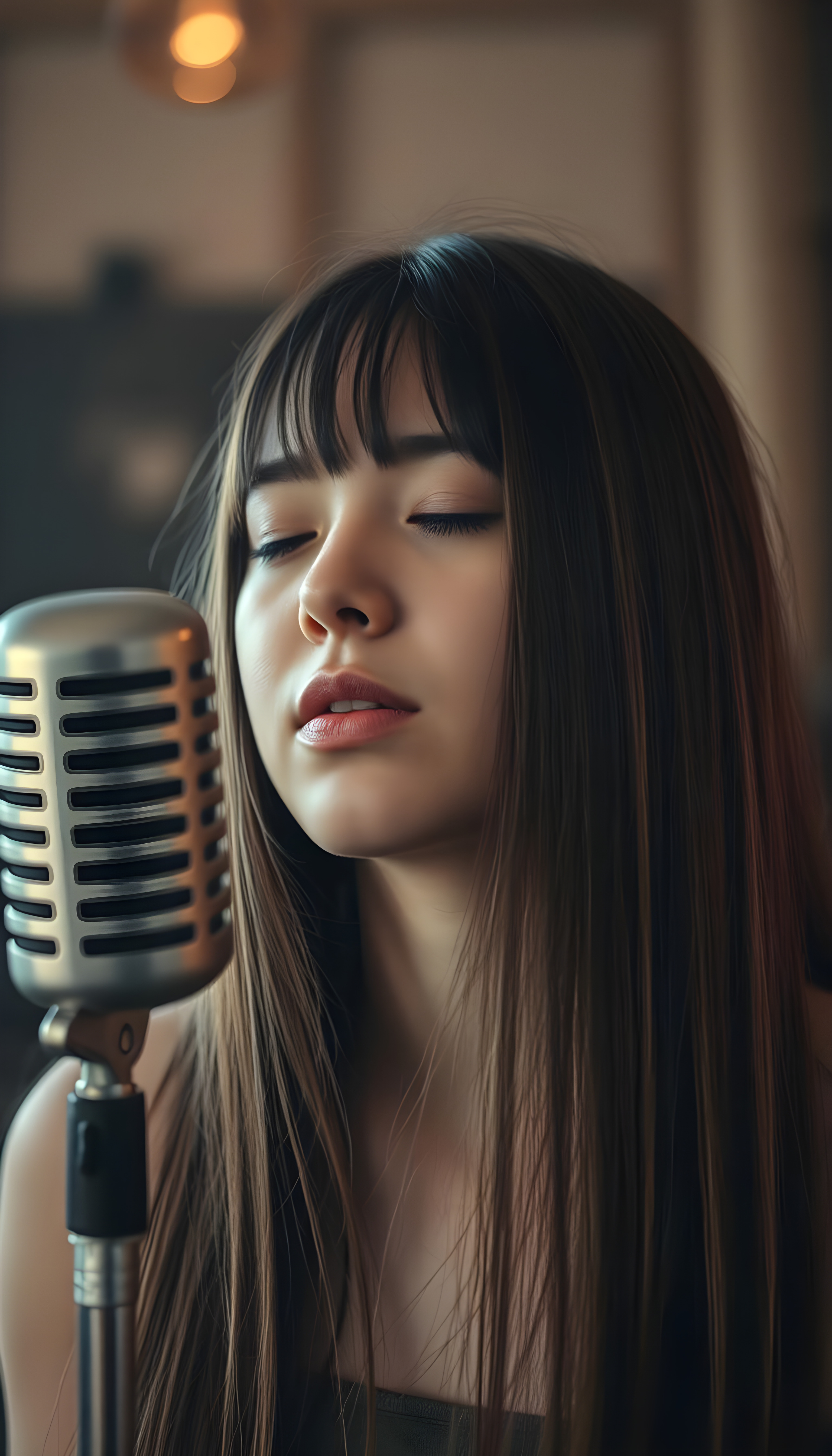 a young singer with long straight hair in front of an old retro microphone, closed eyes
