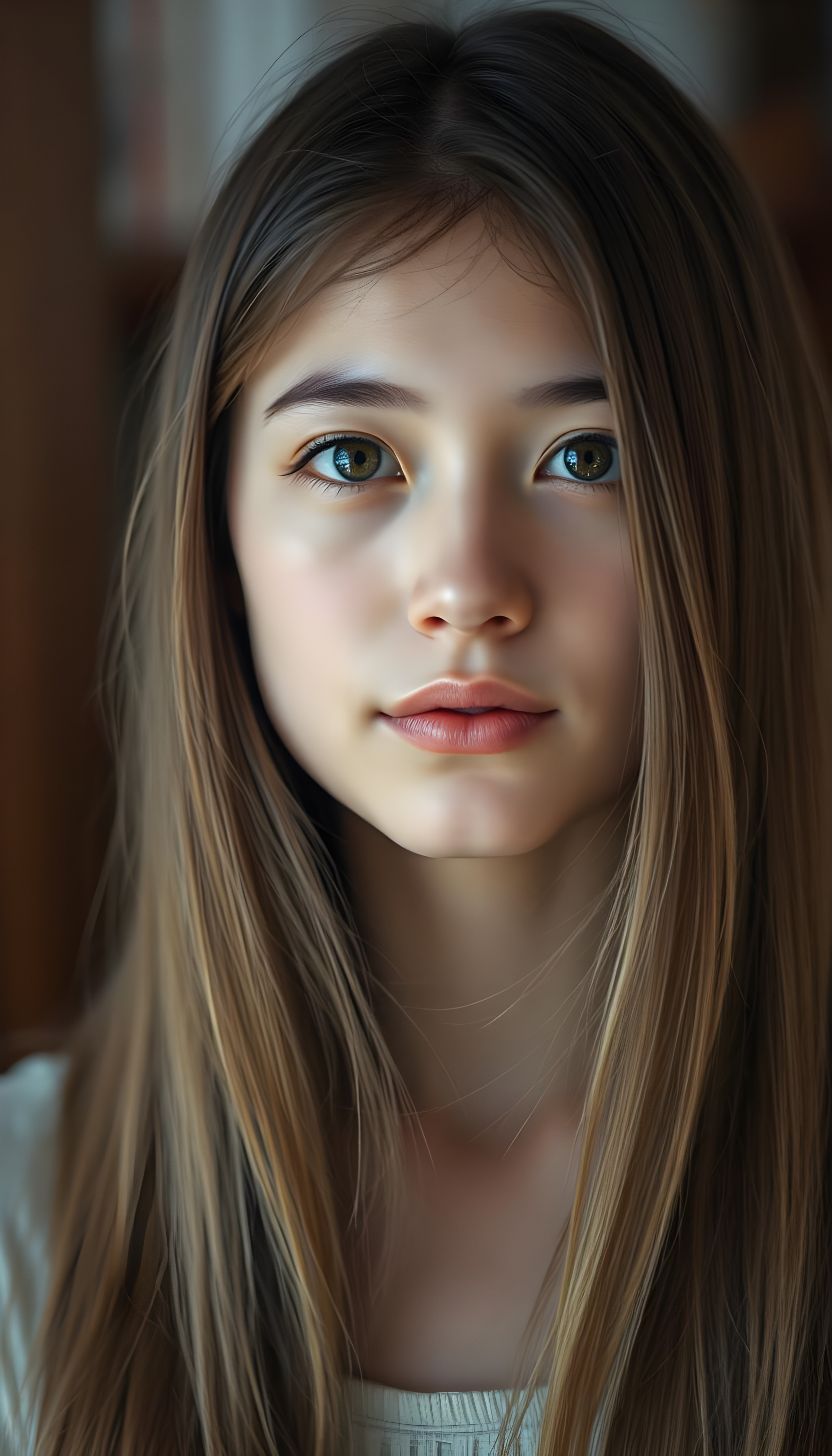 A gentle girl with delicate, long, straight hair, her round head slightly tilted, her eyes sparkling like a diamond, her lips a soft rosy hue, her face perfectly symmetrical, gazing warmly at the viewer, stunning, gorgeous