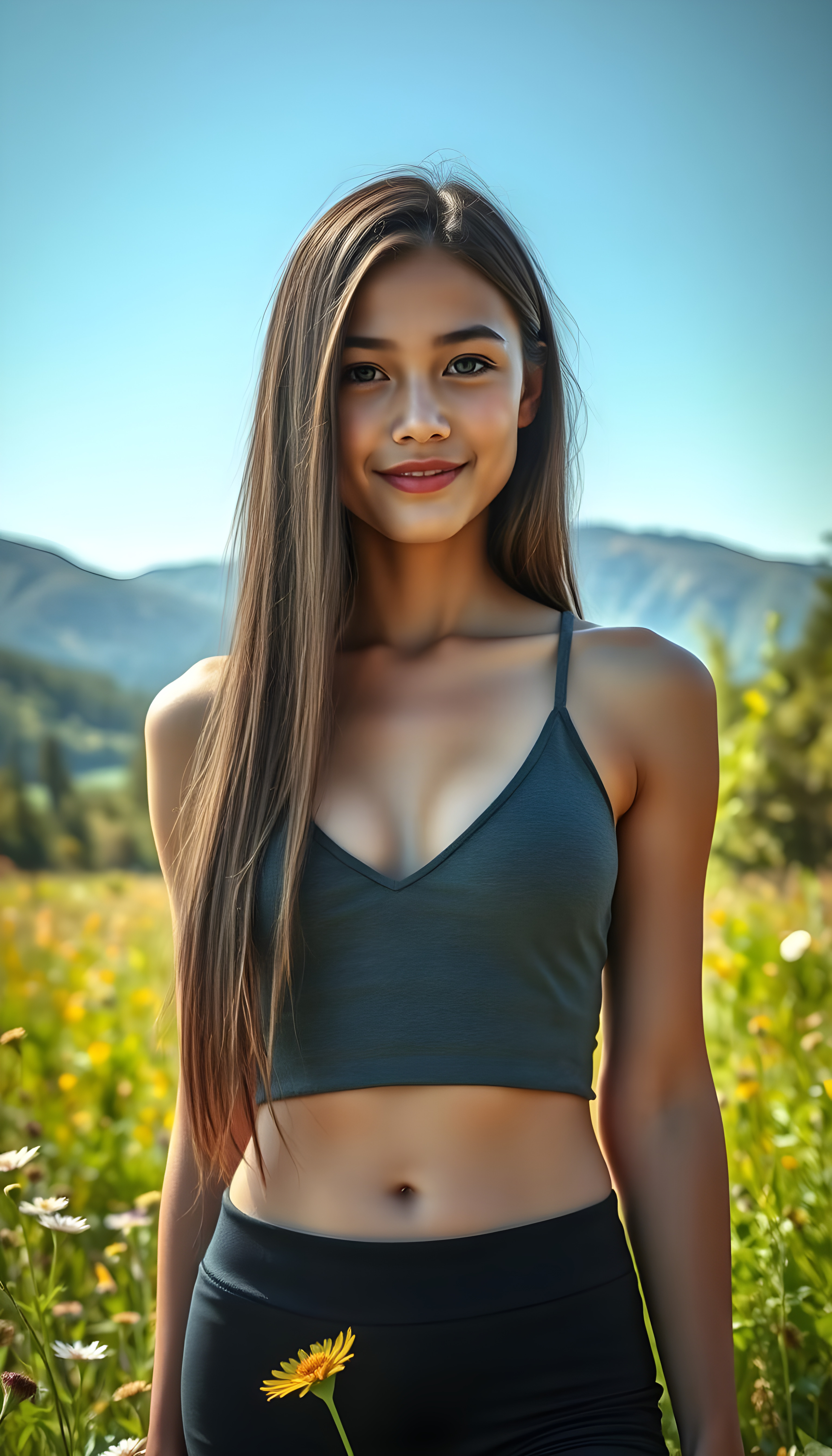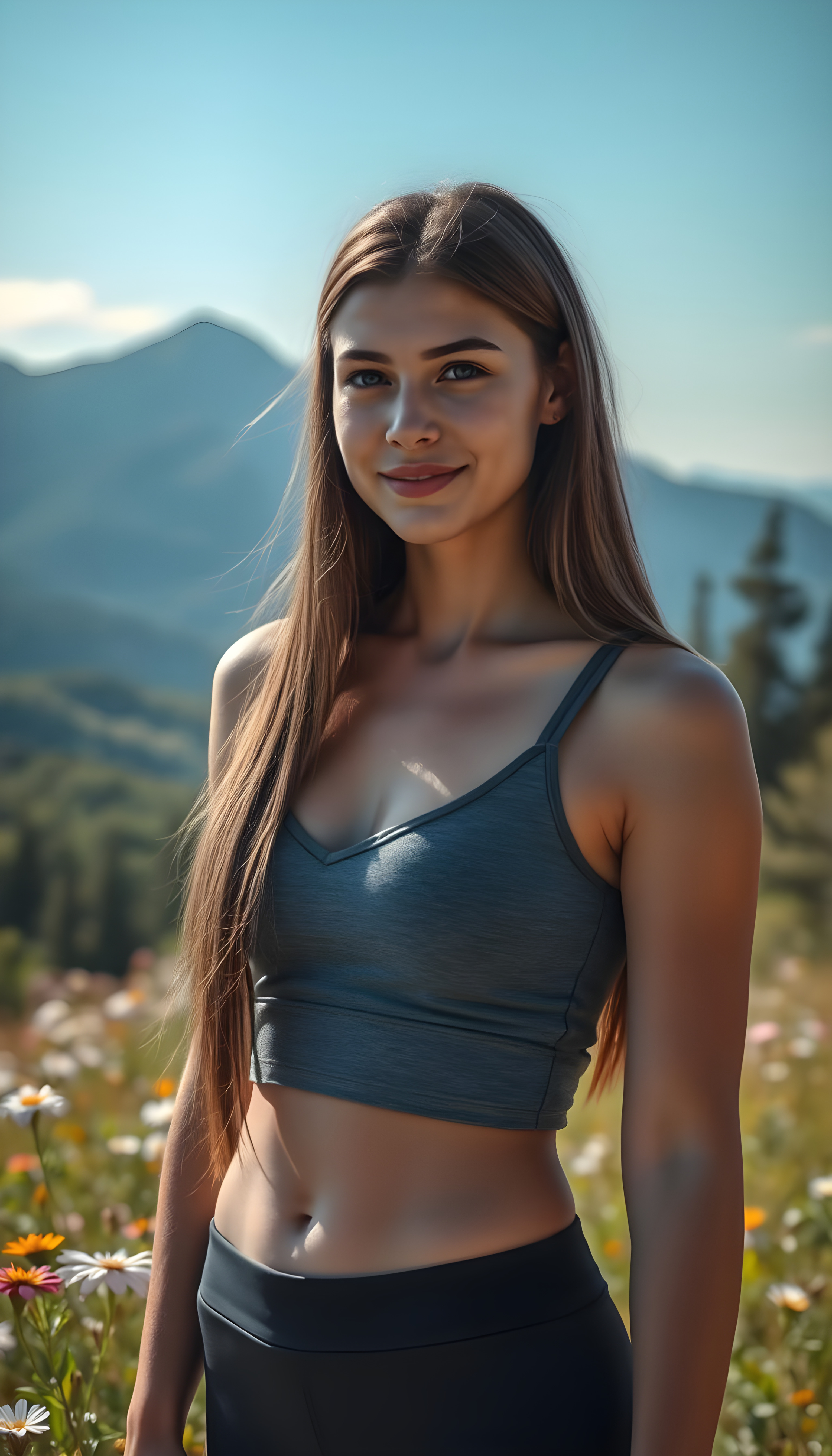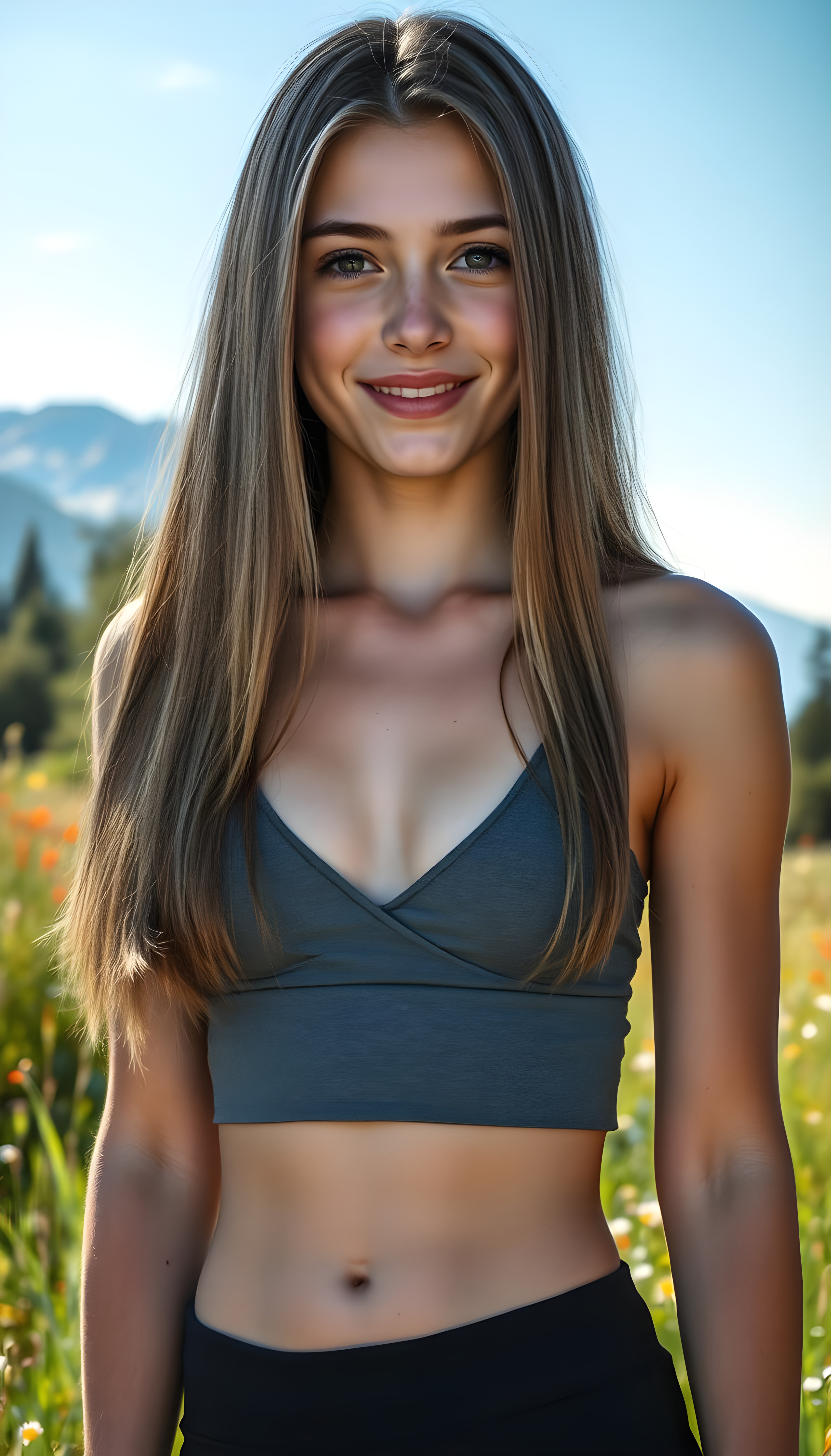 A stunningly detailed portrait of a well busty teenage girl with straight, luxurious hazelnut hair cascading over her shoulders. She stands confidently in a sleek, plunging V-neck grey cropped sports top and form-fitting black shorts. The backdrop is a vibrant, sunlit meadow with wildflowers blooming in the foreground and a distant, majestic mountain range under a clear blue sky. The lighting is soft and warm, highlighting her flawless complexion and the intricate details of her facial features. Her eyes sparkle with a gentle smile, exuding a sense of youthful beauty and grace. The composition includes a shallow depth of field, with the focus on her face and upper body, creating a dreamy, ethereal atmosphere, view from the back