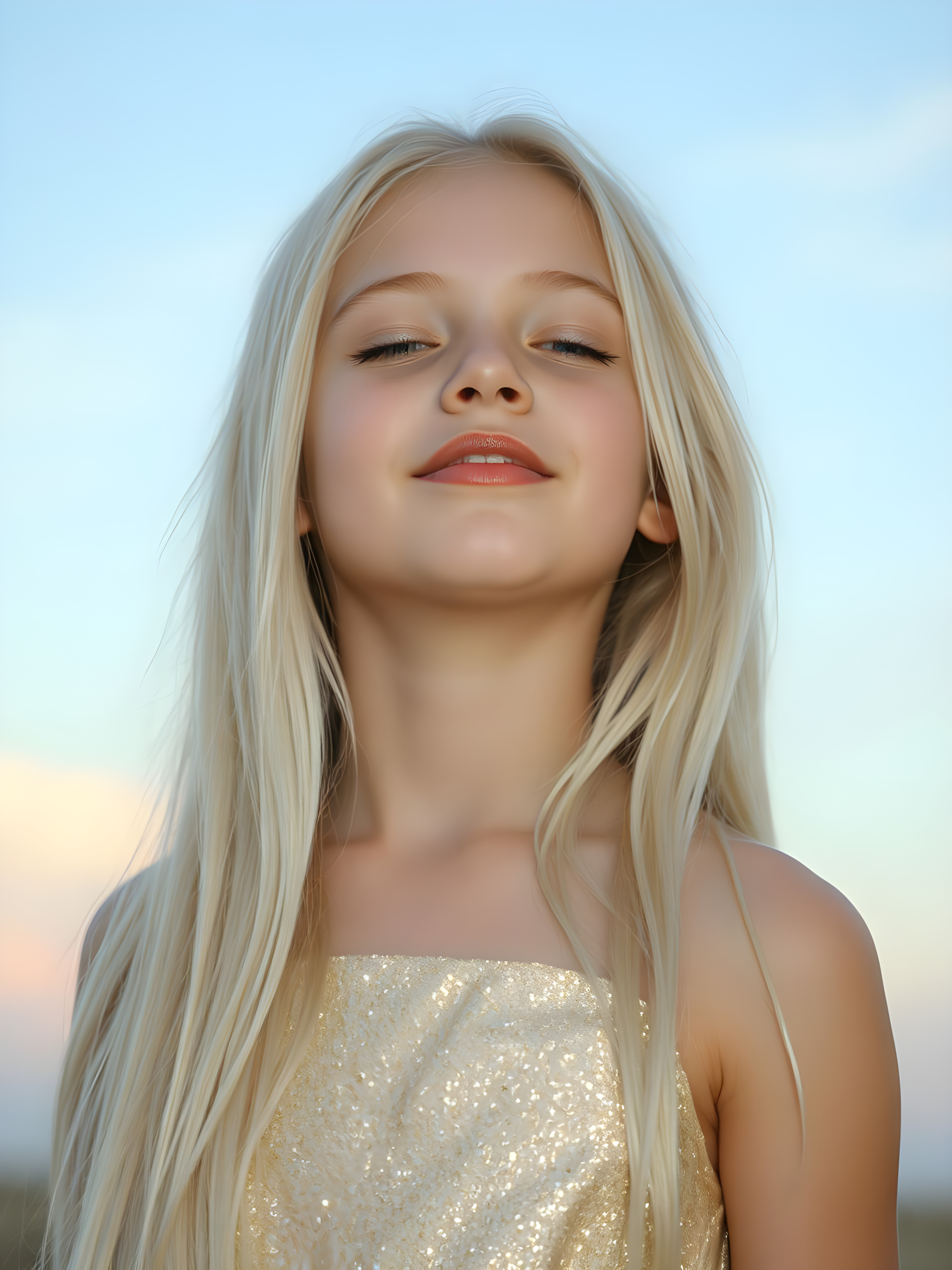 A young girl with long, flowing platinum blonde hair, her eyes closed in anticipation, a round face with full, kissable lips slightly parted, revealing her white teeth, stands against a soft gradient of light blue and lilac. Her head is tilted slightly upwards, wearing a delicate, shimmering gold dress that sparkles under the warm, golden hour light filtering through the serene clouds above. The scene is dreamy, with soft, pastel-colored flowers gently swaying in the breeze around her, creating a romantic and whimsical atmosphere.
