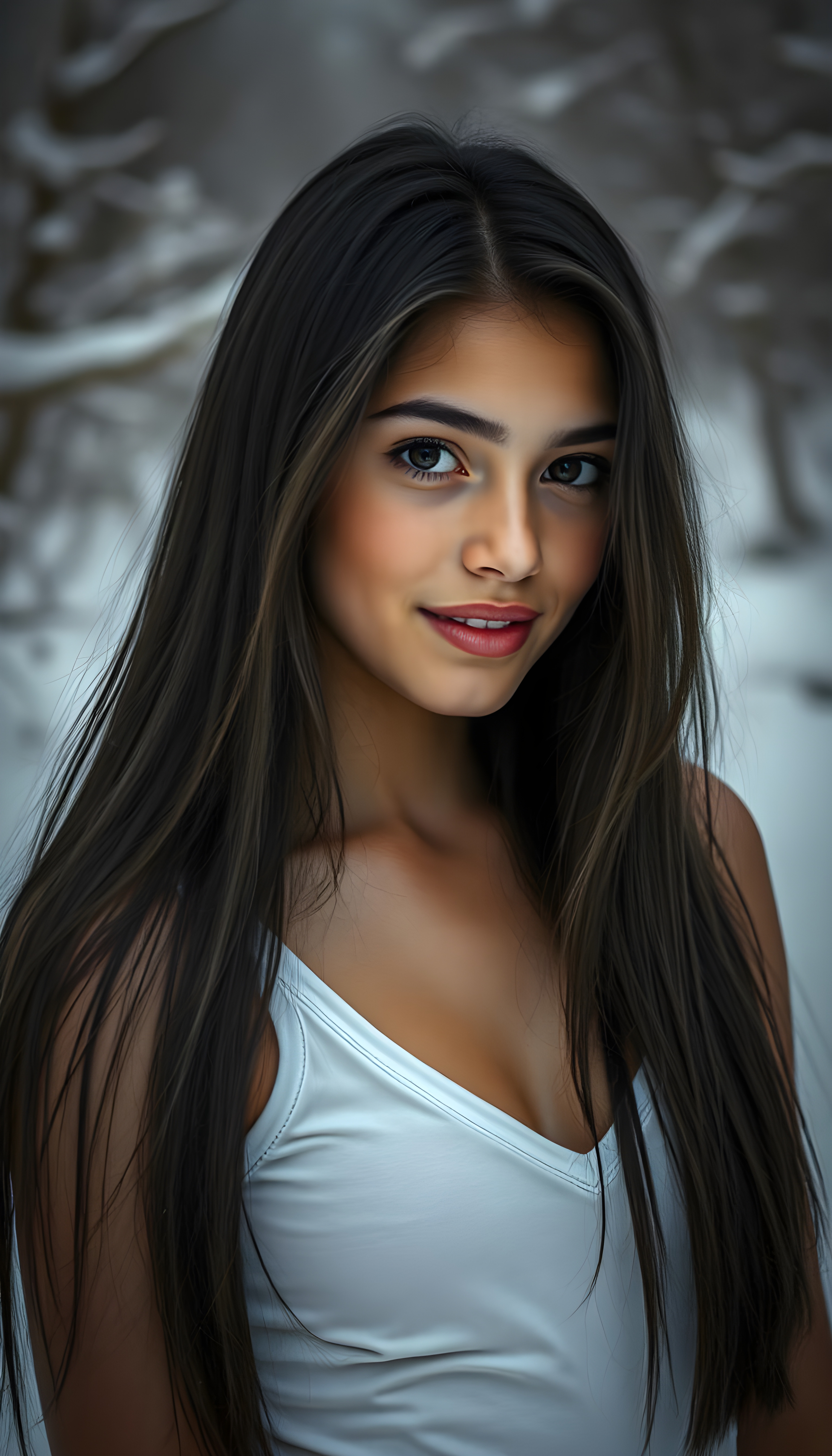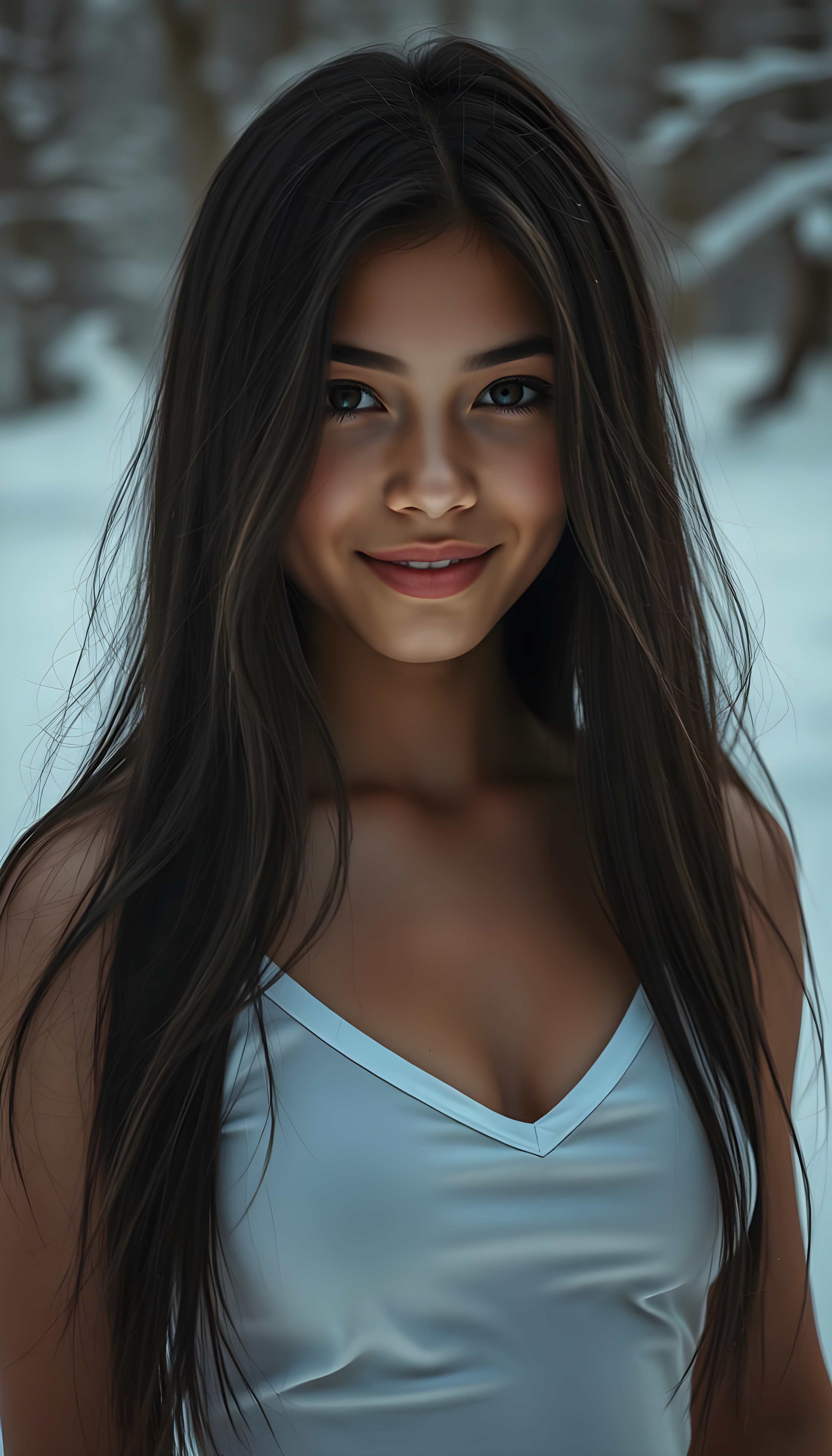 visualize a detailed and realistic photo: a (((stunning young light brown-skinned busty Exotic teen girl with flawless, soft skin))) (glossy hair with subtle layering, (((vivid obsidian black soft straight hair)))), whose frame a (seriously sensual face) with (dramatically contrasting, full, (((natural lips)))), round face and a warm smile, the mouth slightly open with white teeth, (light brown eyes), set against a (broodingly atmospheric snow backdrop) for an unforgettable (upper body shot). Her features are captured in (intense detail), accentuated by the (ombré shadow and highlights) that draw the eye, ((she wears a white v-neck tank top that emphasizes her perfectly shaped body)), ((gorgeous)) ((side view))