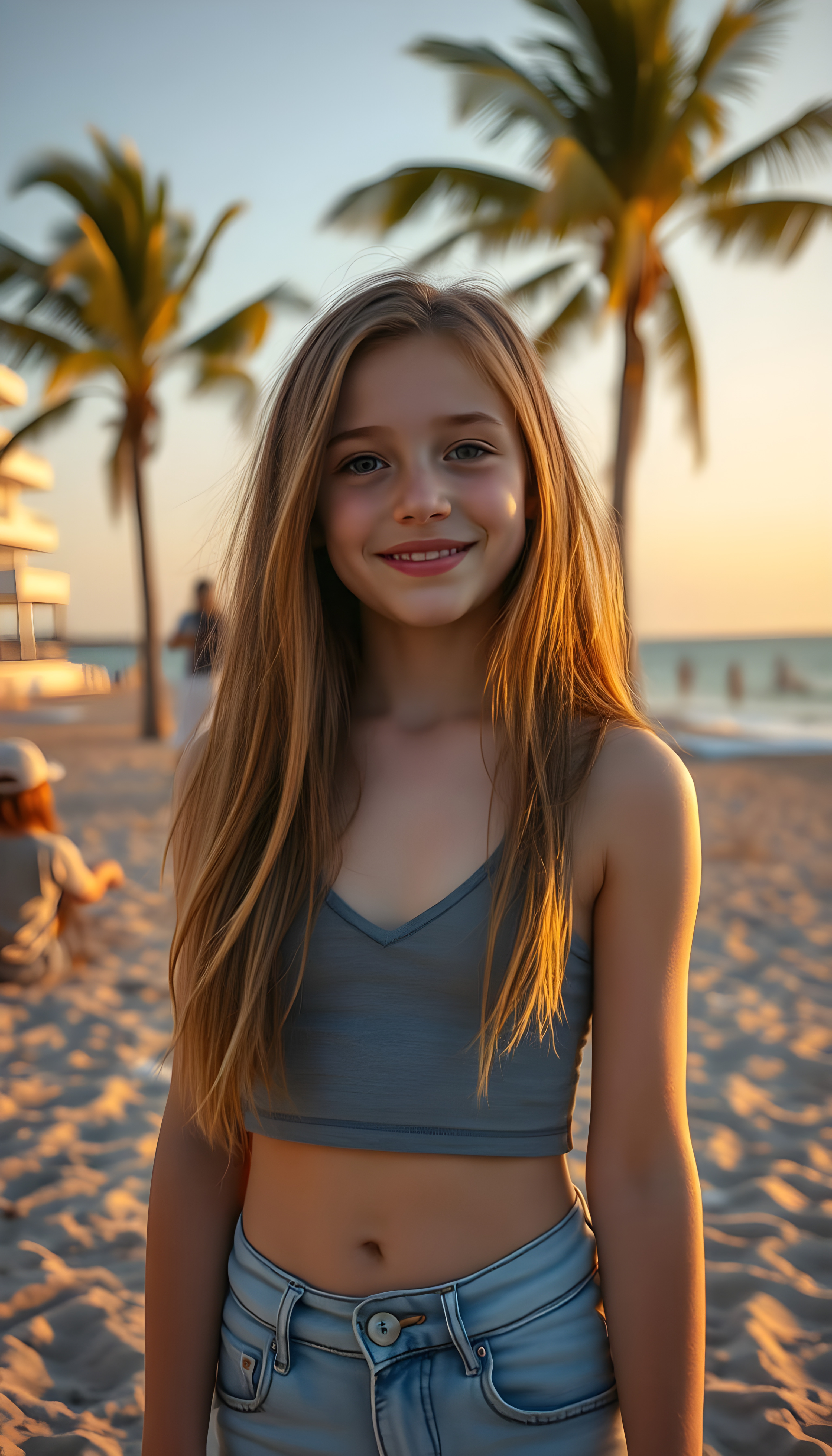 A cheerful young girl with long, vibrant shoulder long red hair same length left and right, stands on a sandy beach at sunset. She wears a grey, tight, deep v-neck cropped tank top and playful, denim shorts. Her full lips and sparkling brown eyes capture the warm, golden light. The beach resort behind her is bustling with activity, featuring palm trees swaying gently in the breeze. The ocean is a stunning gradient of blues and purples, with gentle waves lapping at the shore. The scene is serene, with a mix of natural and vibrant colors, creating a lively yet peaceful atmosphere.