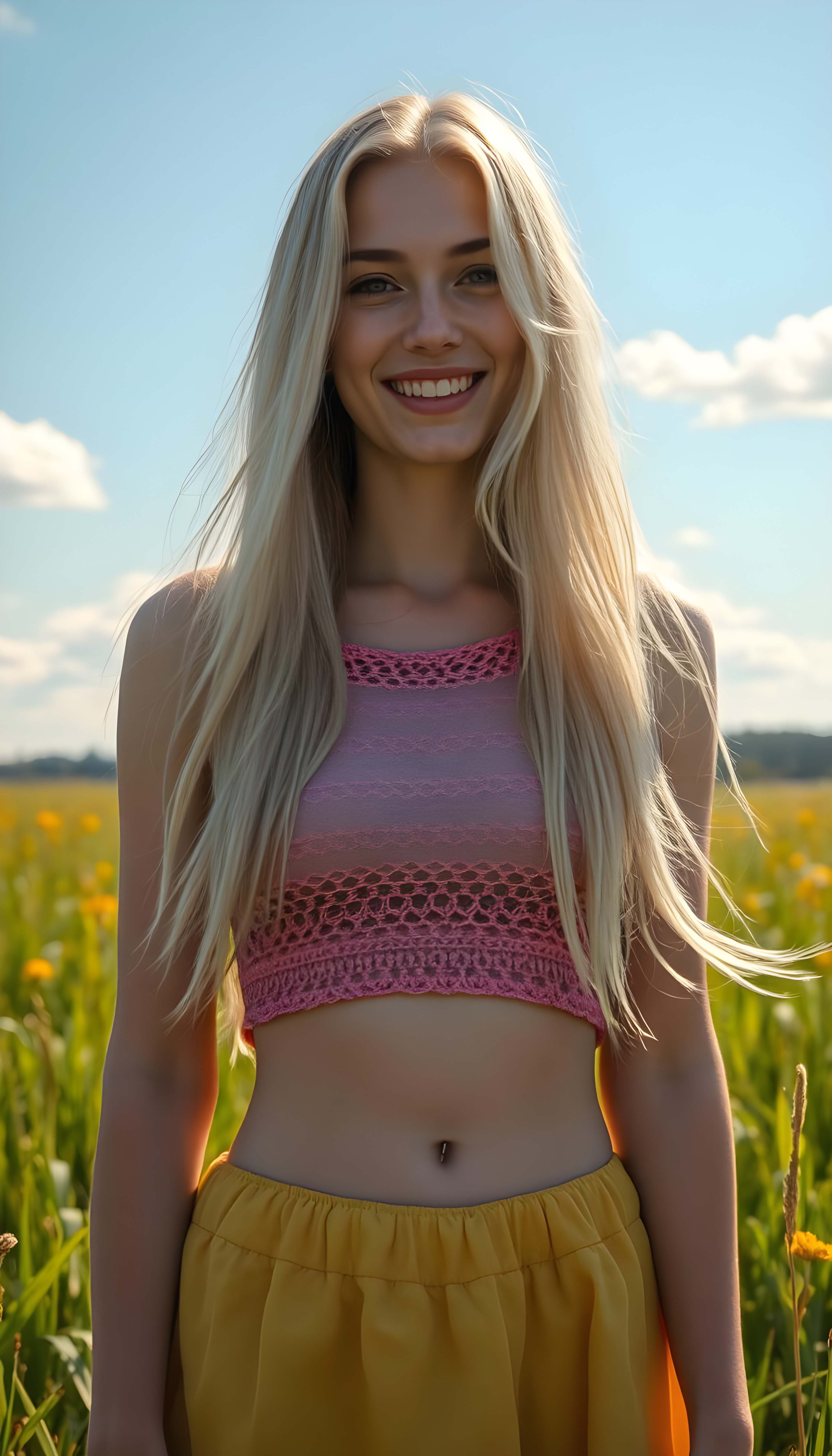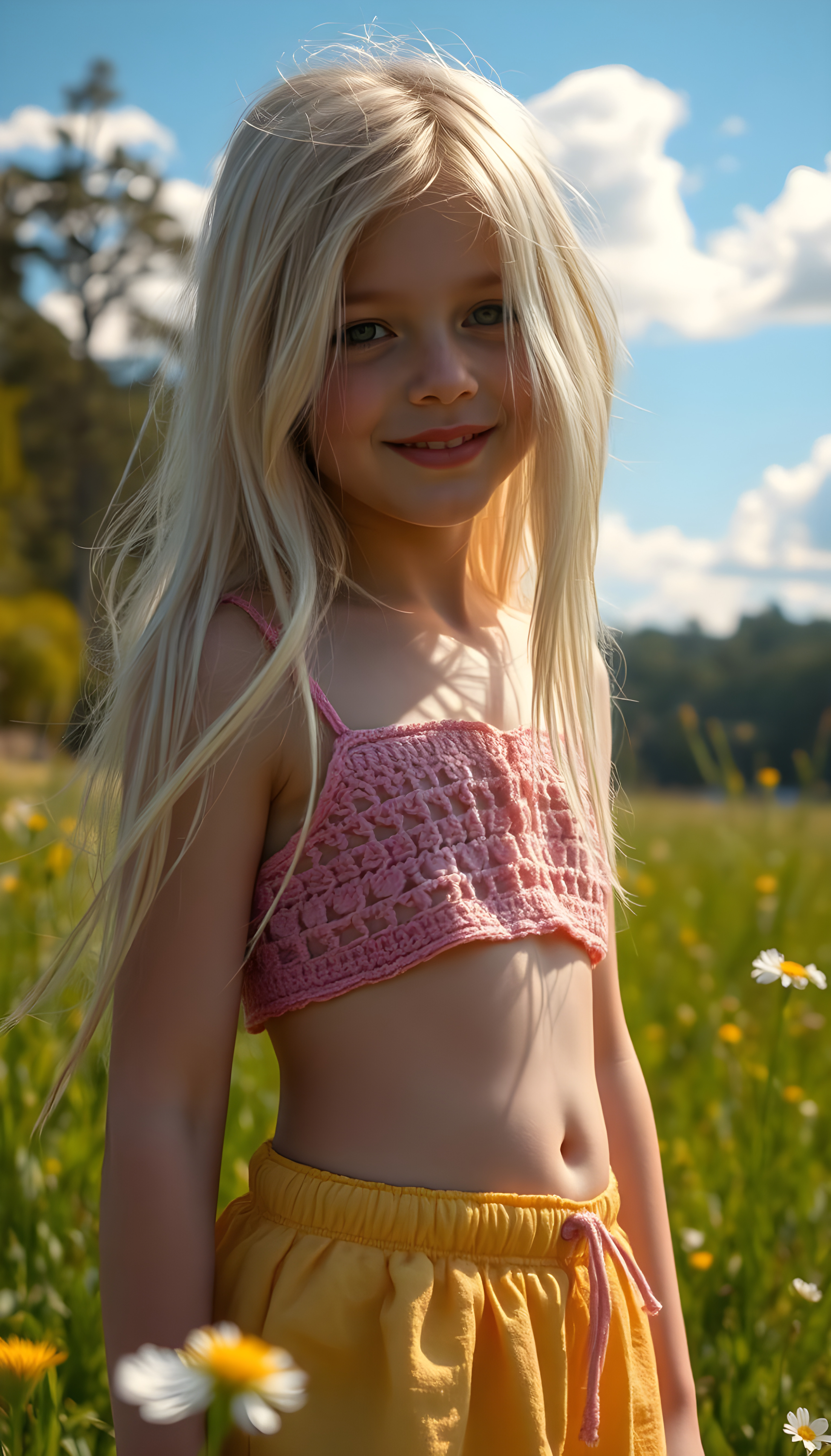 A young ATTRIBUT with pale skin and long, flowing white hair, wearing a pink crocheted top and a yellow mini skirt, you can see her belly button, stands in a sunny meadow with lush green grass. The scene is bathed in warm, golden sunlight, casting a soft, dreamy glow over everything. She smiles warmly. The background features a clear blue sky with fluffy white clouds and a distant forest, creating a serene and enchanting atmosphere.