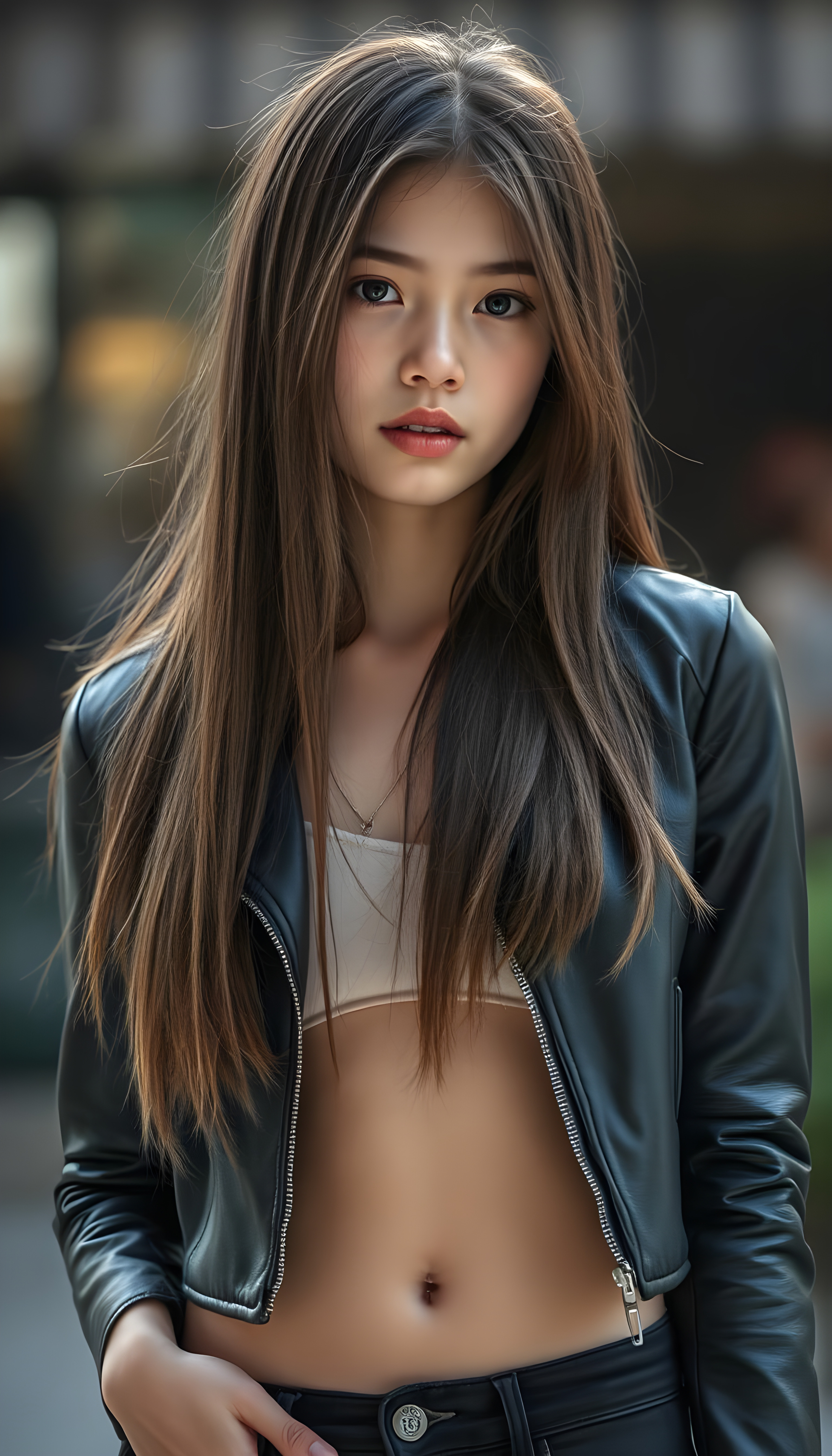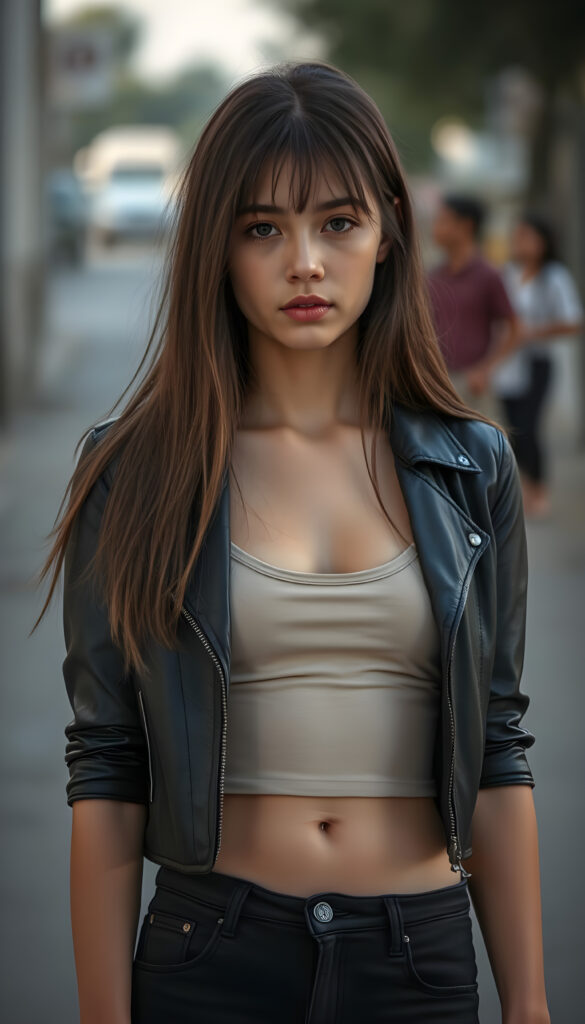 a cute teen girl, best quality, masterpiece, ultra high resolution, photo realistic, detailed skin, ((black short open aviator leather jacket, (underneath, she wears a light, thin tank top that emphasizes her perfect feminine body)), (long straight brown hair falls down in the same length right and left), you can see her cute belly button, black denim jeans pants