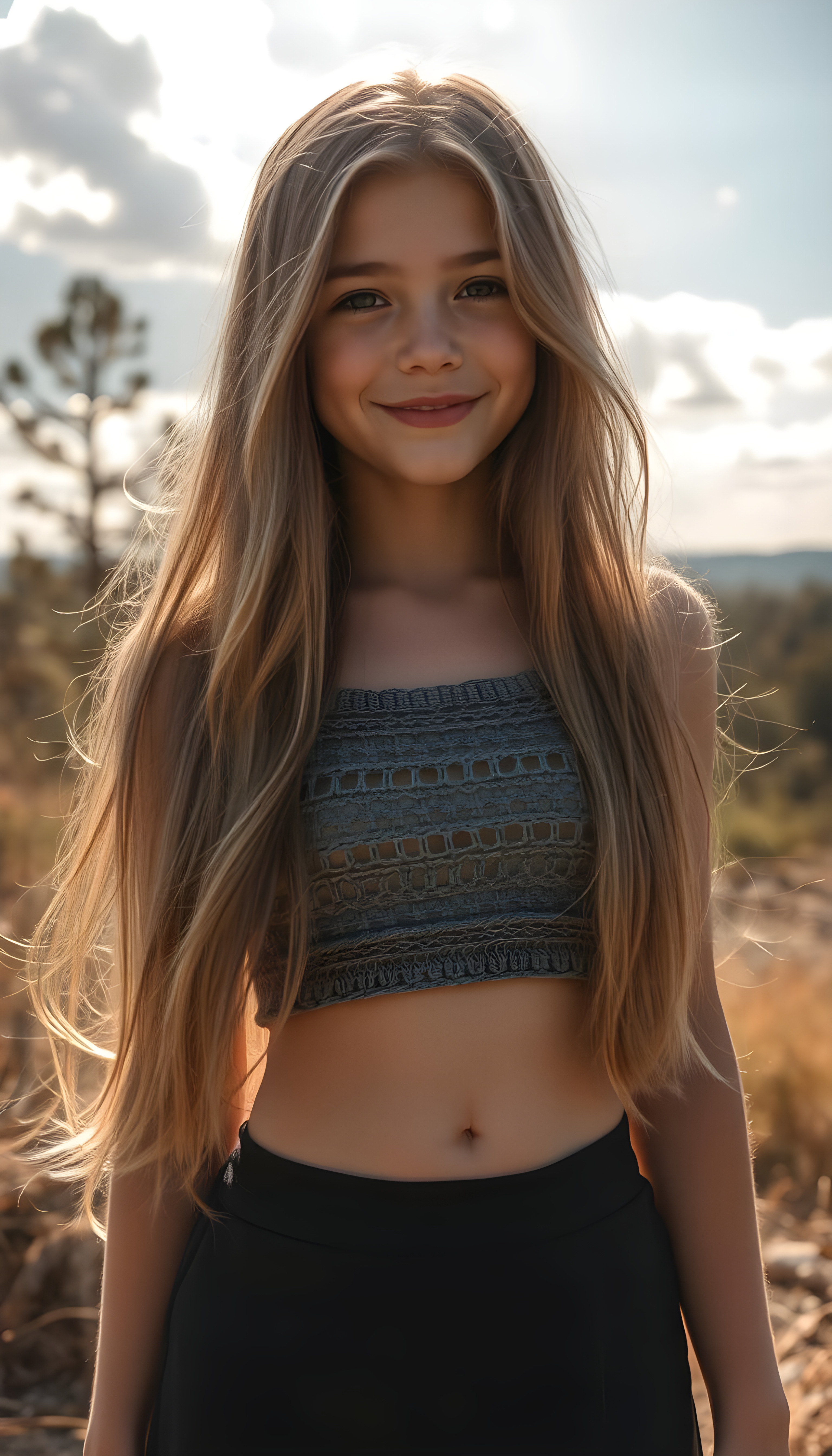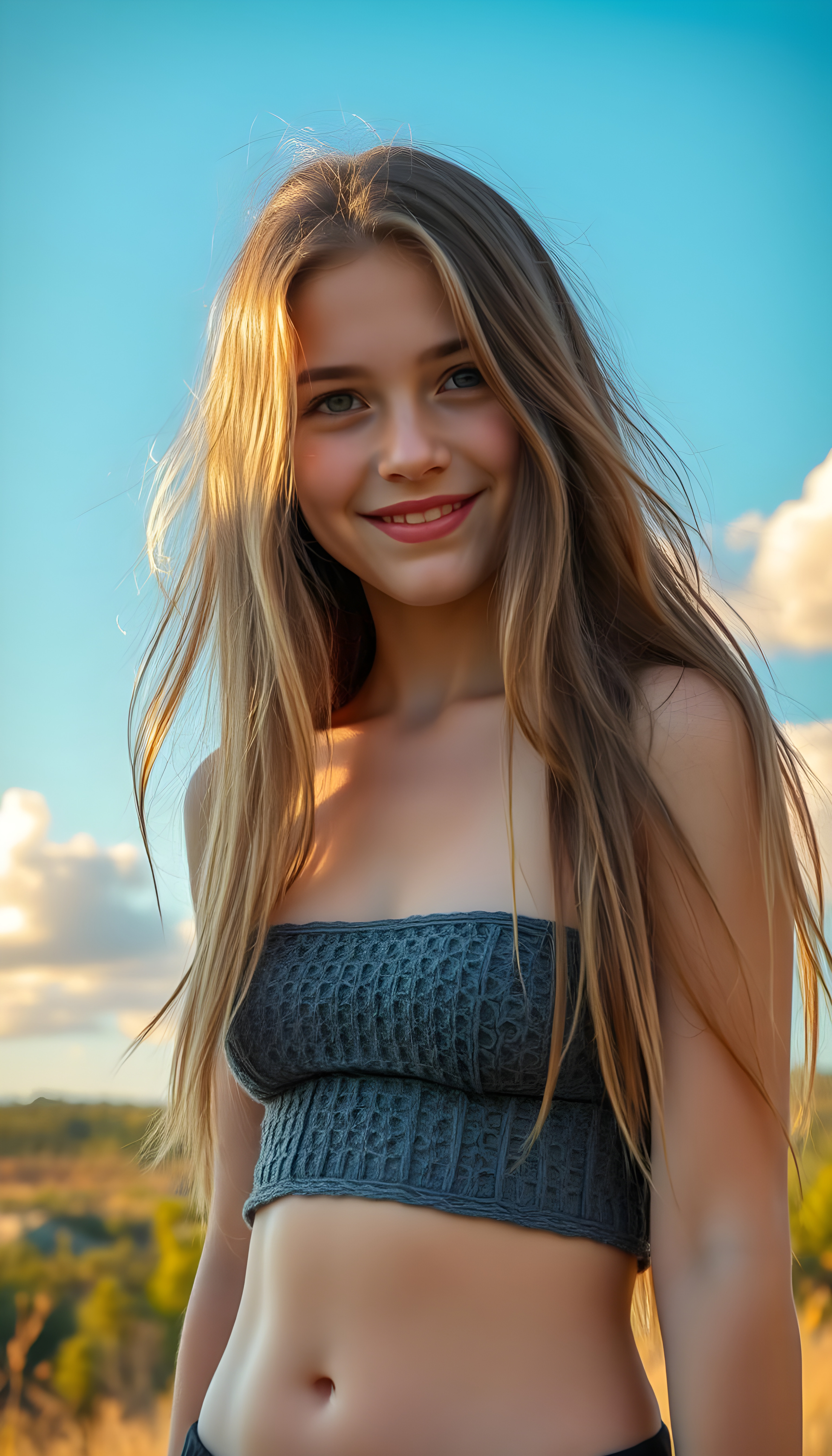 a full body shot from a cute busty teen girl with pale skin and long, flowing brown hair and blond highlights, wearing a grey crocheted top and a black mini skirt, you can see her belly button, stands in front of you. The scene is bathed in warm, golden sunlight, casting a soft, dreamy glow over everything. She smiles warmly. The background features a clear blue sky with fluffy white clouds and a distant forest, creating a serene and enchanting atmosphere.