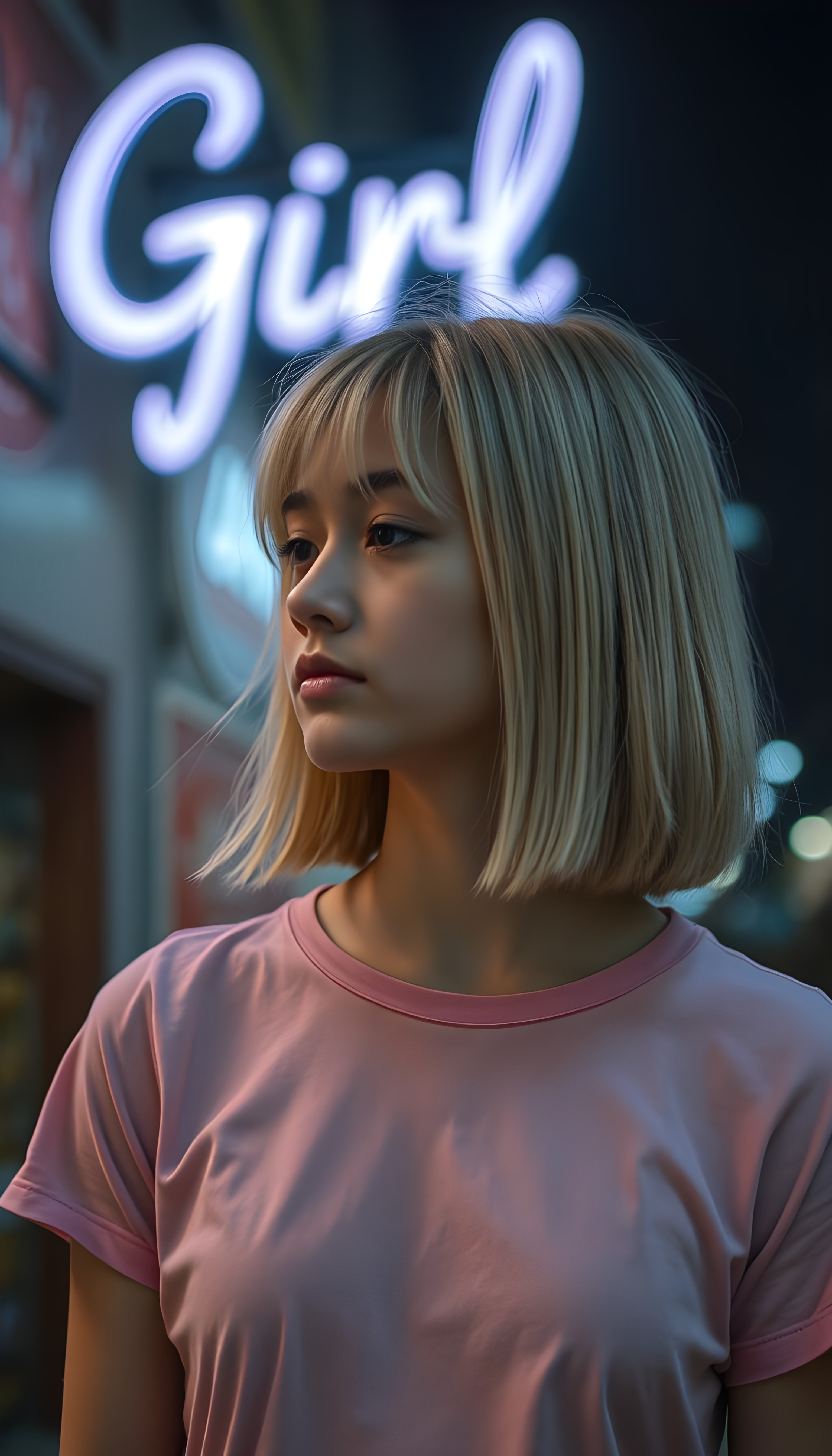 A stunning, confident well busty teenage girl with long, wavy blonde hair poses elegantly in a futuristic, shimmering silver tube top and matching shorts, exuding youthful energy. Her outfit is complemented by her distressed denim jeans, adding a touch of casual coolness. The scene is set against a vibrant, glowing purple backdrop with floating holographic particles, creating a dynamic and futuristic atmosphere. The lighting is bright and soft, highlighting her features and outfit, with a subtle gradient of pink and blue hues in the background, giving the image a lively and imaginative feel.
