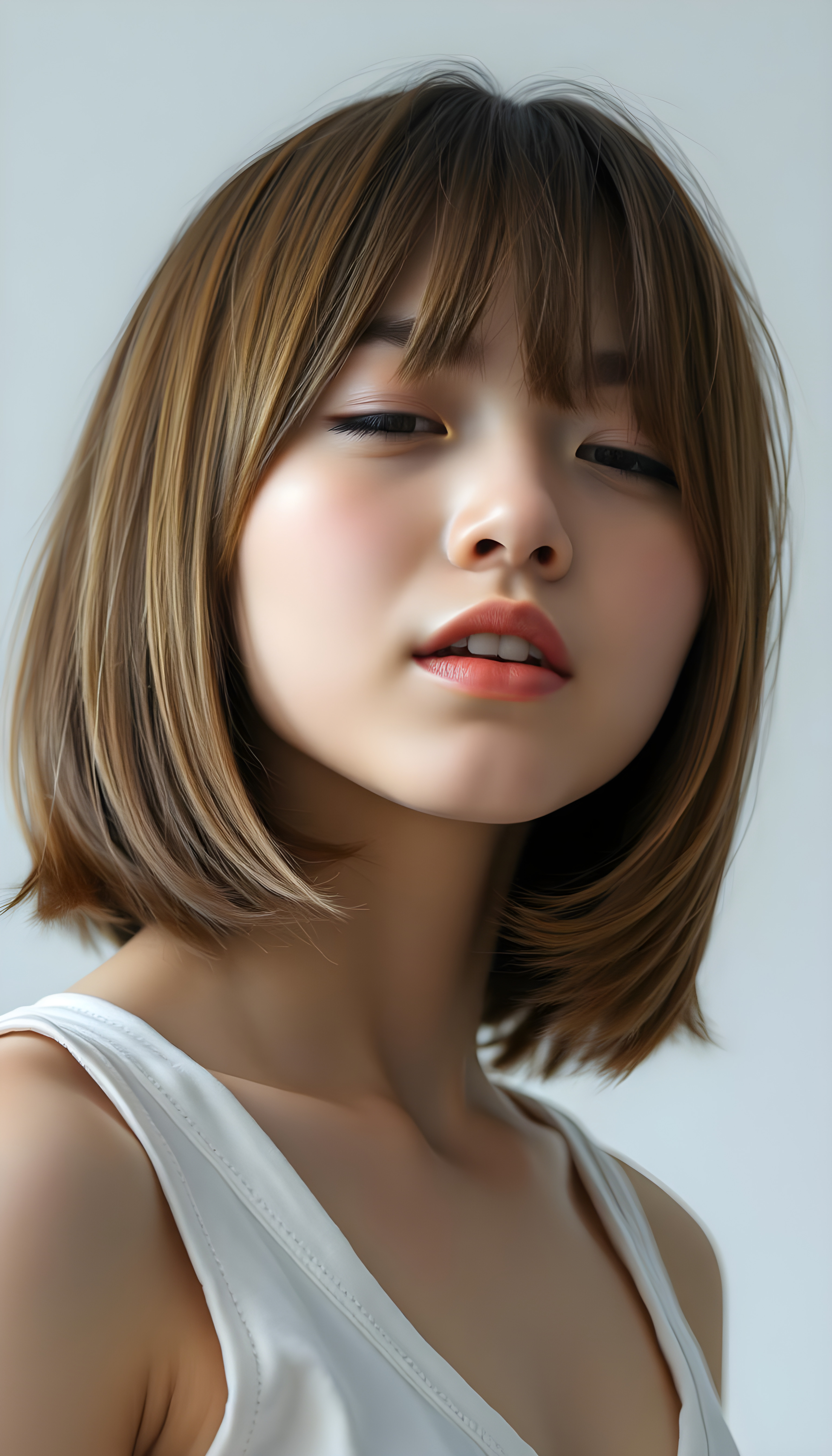 a very cute young busty teen girl, with realistic wavy soft long light brown blond hair, with naturally soft and slightly tanned skin, her lips are full and devoid of pigmentation, wearing a tight short thin v-neck white t-shirt. She exudes stunning beauty, in a fashion sense, photo-realistic, 4k, high quality and detailed details in her features and surroundings. full body view ((upper body inclusive)), showcasing her beautiful and natural looking skin and perfectly straight hair, in a classic portrait position, with a warm and soft light effect + asian touch