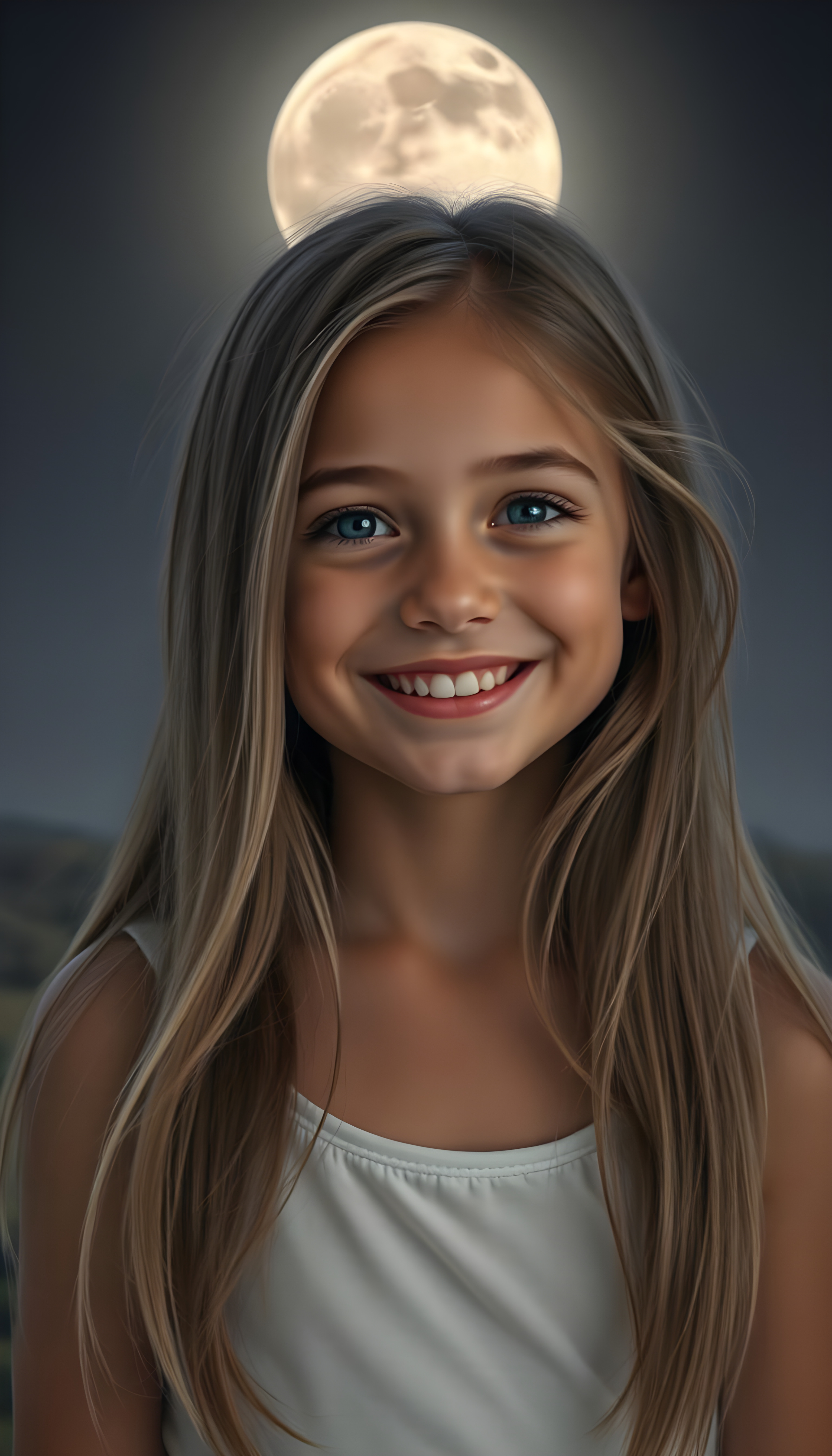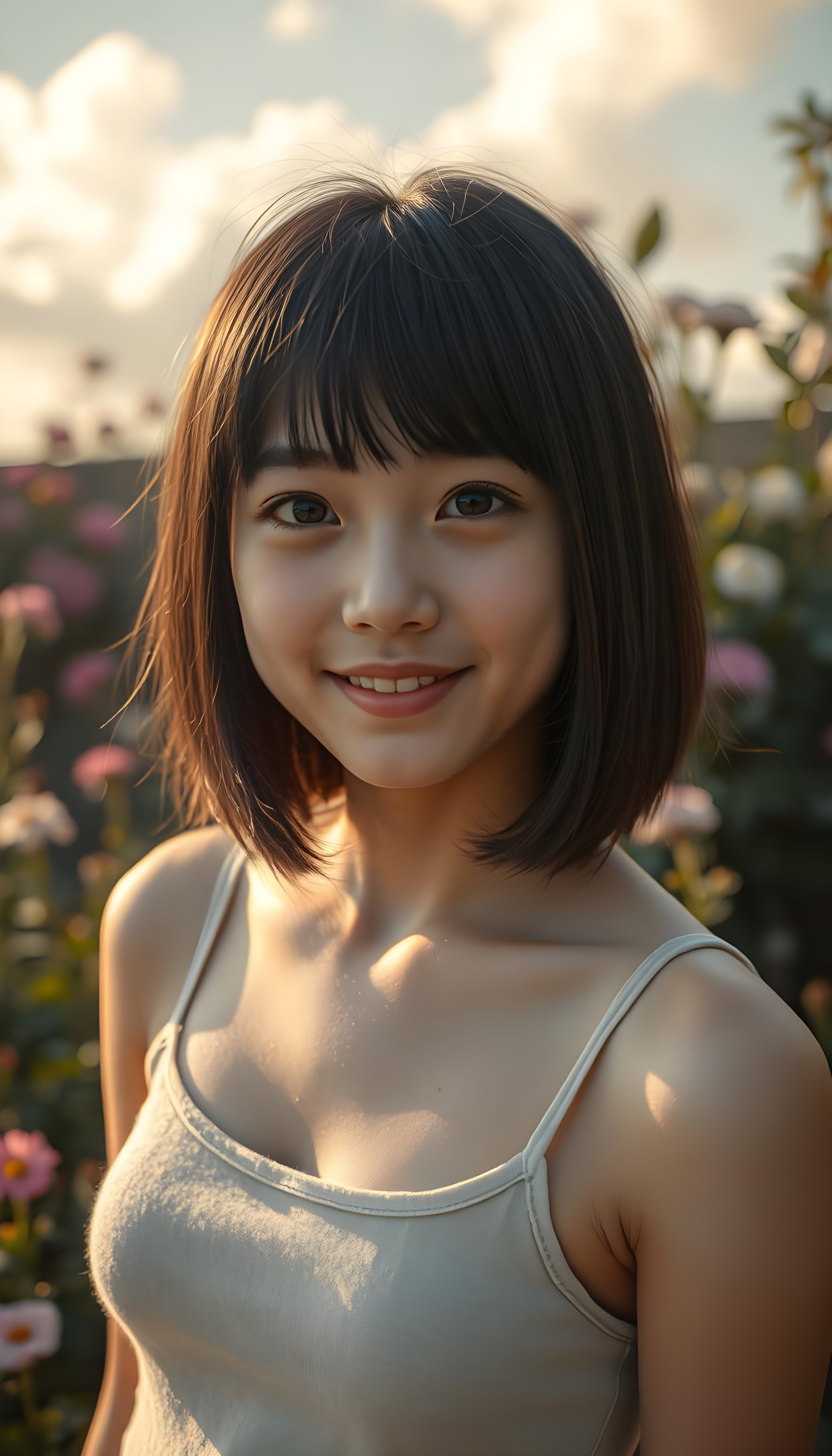 A close up photo show a young girl with long, flowing black hair and round, expressive eyes stands confidently in a vibrant, sunlit park. She wears a short, cropped black tank top that accentuates her perfect curves. Her full, kissable lips are slightly parted, revealing a warm smile. The background features lush green grass, colorful flowers, and tall trees with sunlight filtering through the leaves, casting a soft glow on her flawless skin. The scene is bright and cheerful, with a sense of playful energy and youthful charm