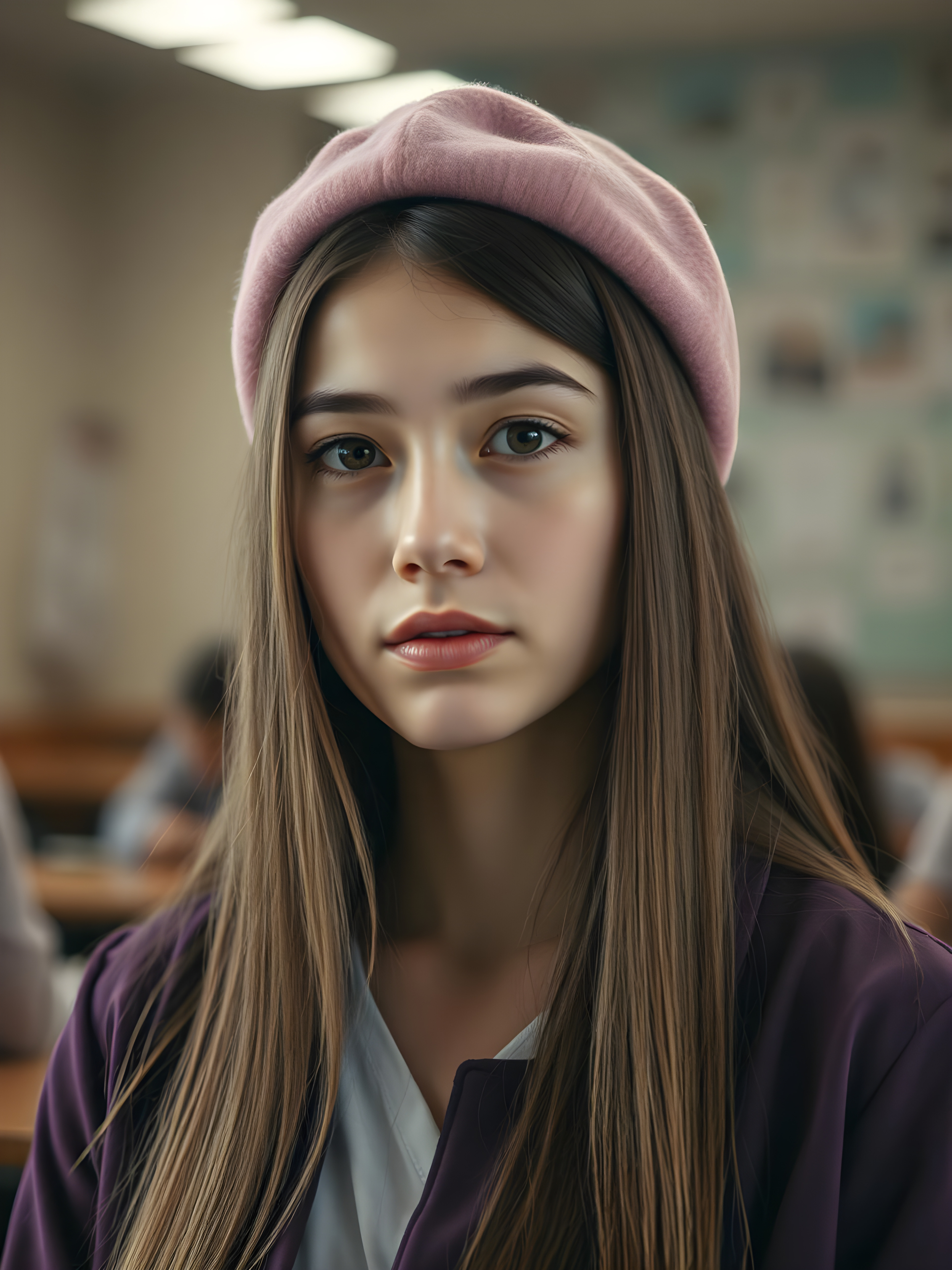 A hyper-realistic portrait of a young woman straight golden hair; pink beret; long straight dark brown hair; purple jacket with white collar; intelligent, confident expression; classroom setting with soft focus; warm indoor lighting