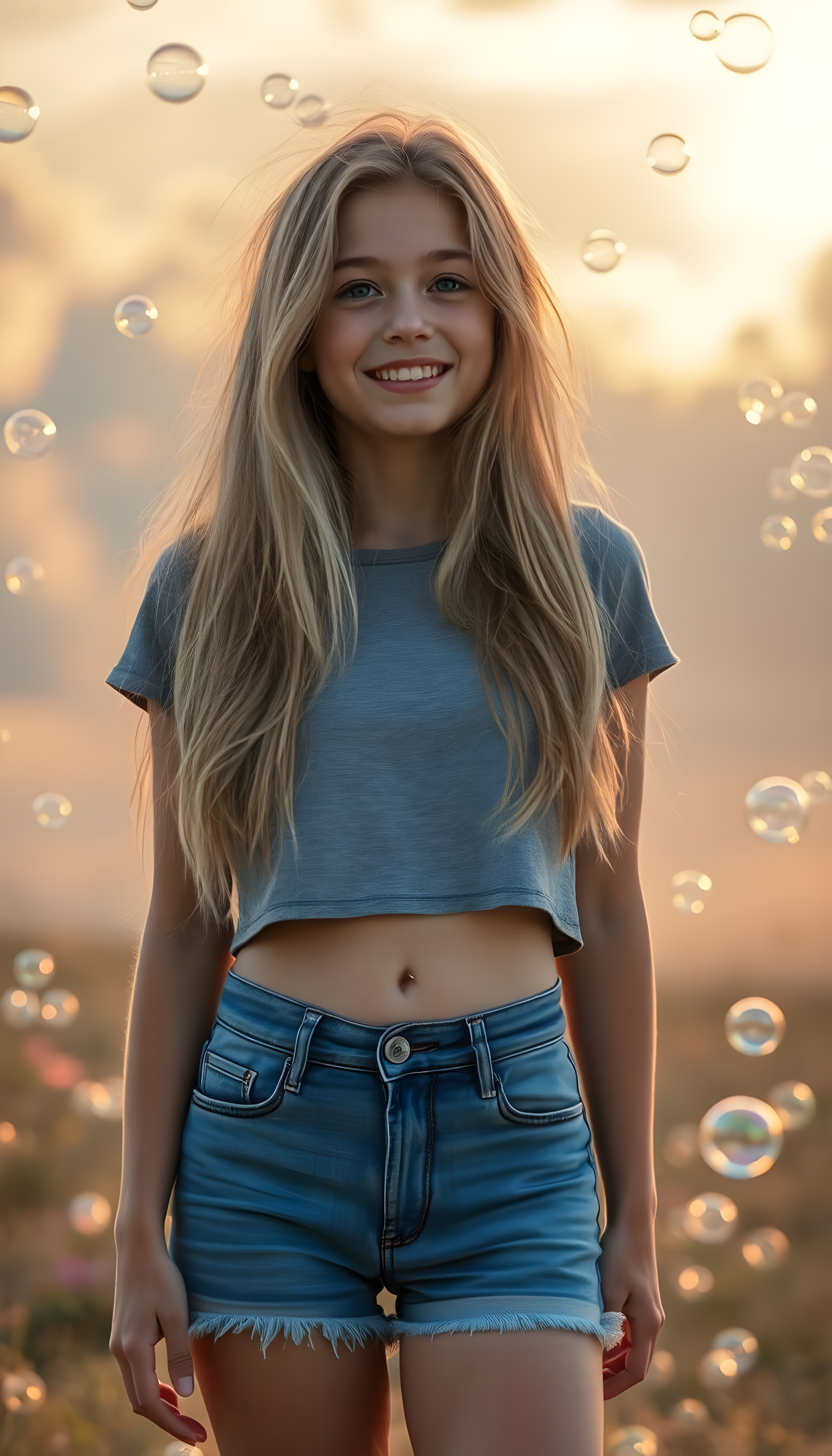 A whimsical scene where a young woman with long, soft, golden hair stands confidently in the foreground, her blue short denim jeans contrasting against the soft grey of her cropped t-shirt. She has a cute round belly button. She is surrounded by a magical cascade of iridescent soap bubbles that float and shimmer in the air, creating a sense of wonder and enchantment. The background is a dreamy, pastel-colored landscape with fluffy clouds and a soft, golden sunset, casting a warm glow over the entire scene. The lighting is soft and ethereal, enhancing the magical atmosphere. The girl’s expression is one of joy and curiosity, capturing the viewer’s imagination and inviting them into this enchanting world.