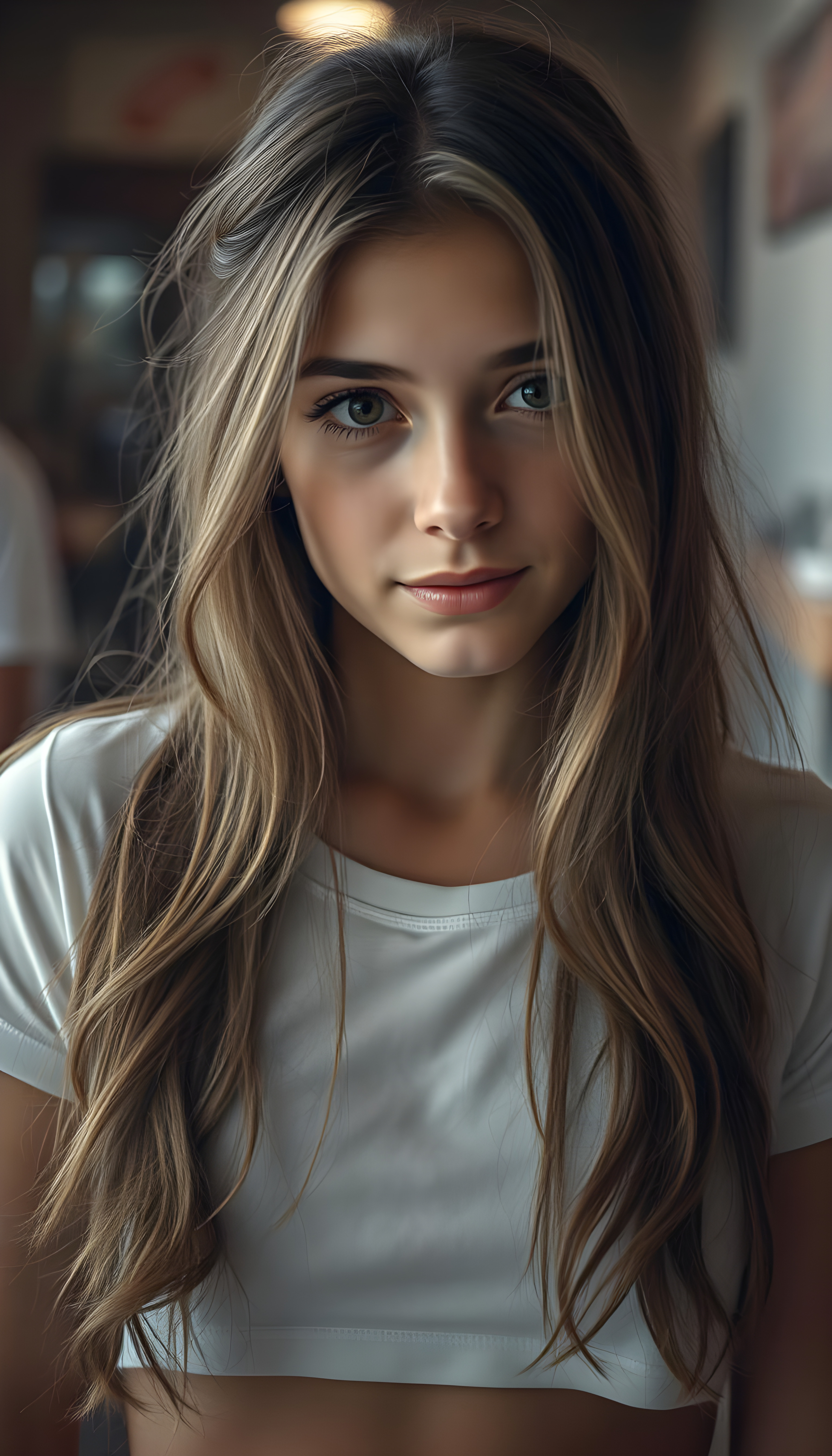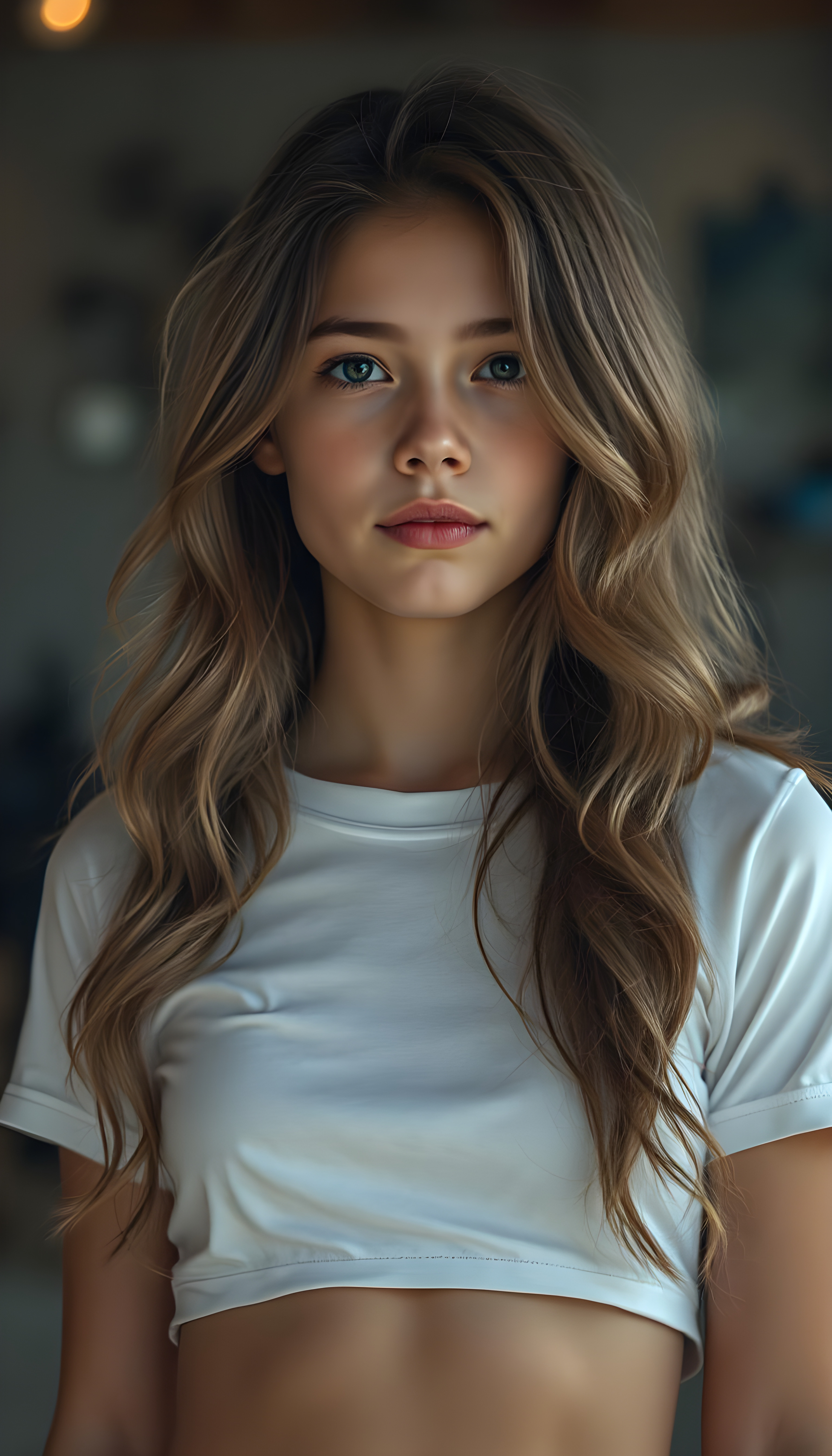 Show me a hyper realistic photo, cute adult busty tomboy girl with long wavy light brown hair, wearing a cropped white T-shirt, with a small round belly button.