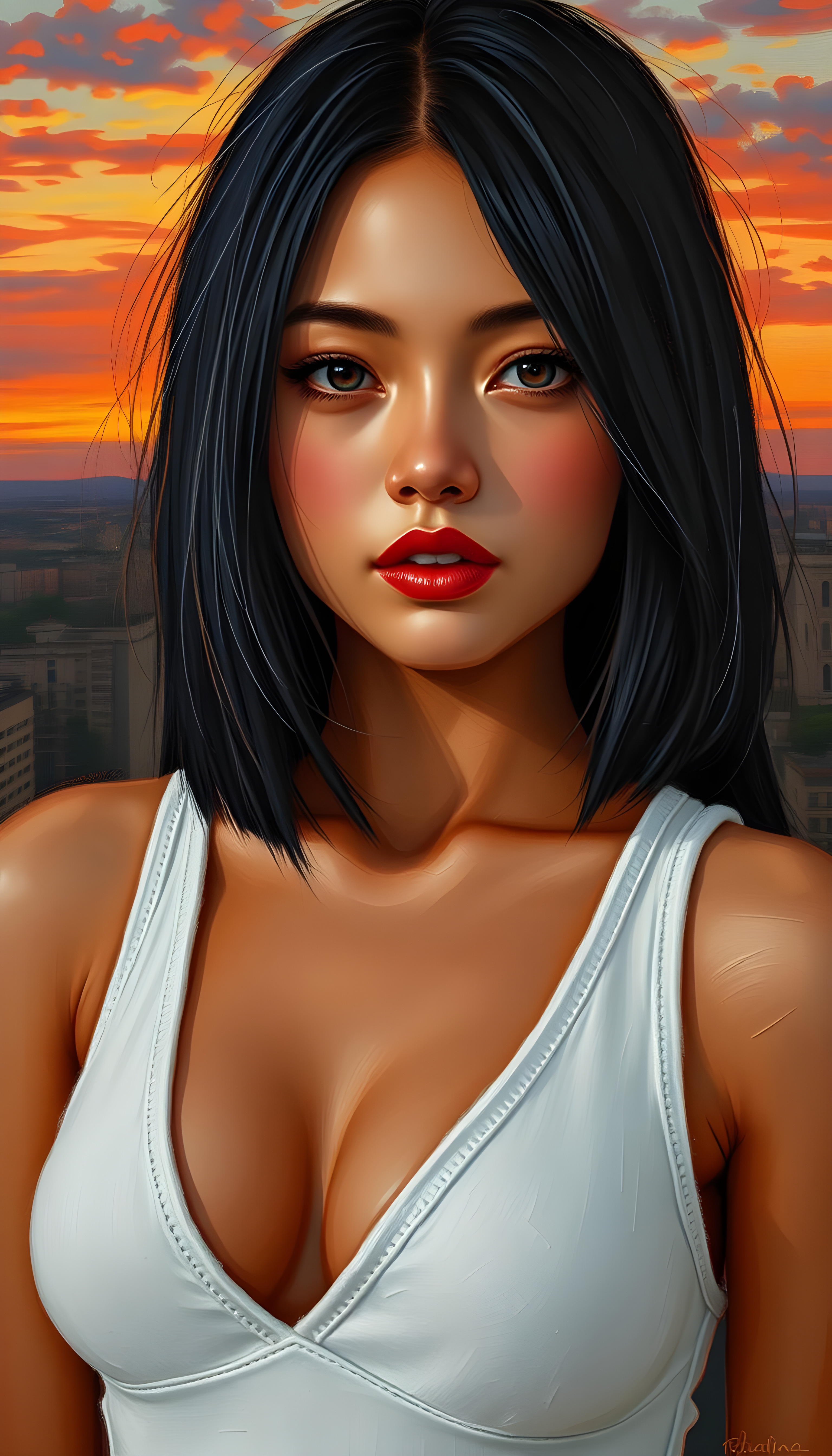a stunning beautiful well busty girl, straight full open black hair, the hair has exact the same length left and right, cute face, bob cut, romantic atmosphere, photo realistic, beautiful sunset, sun kissed skin, white fine plain tank top made of fine wool and low v-neck, wide open front, seductive glance over the shoulders, full lips.