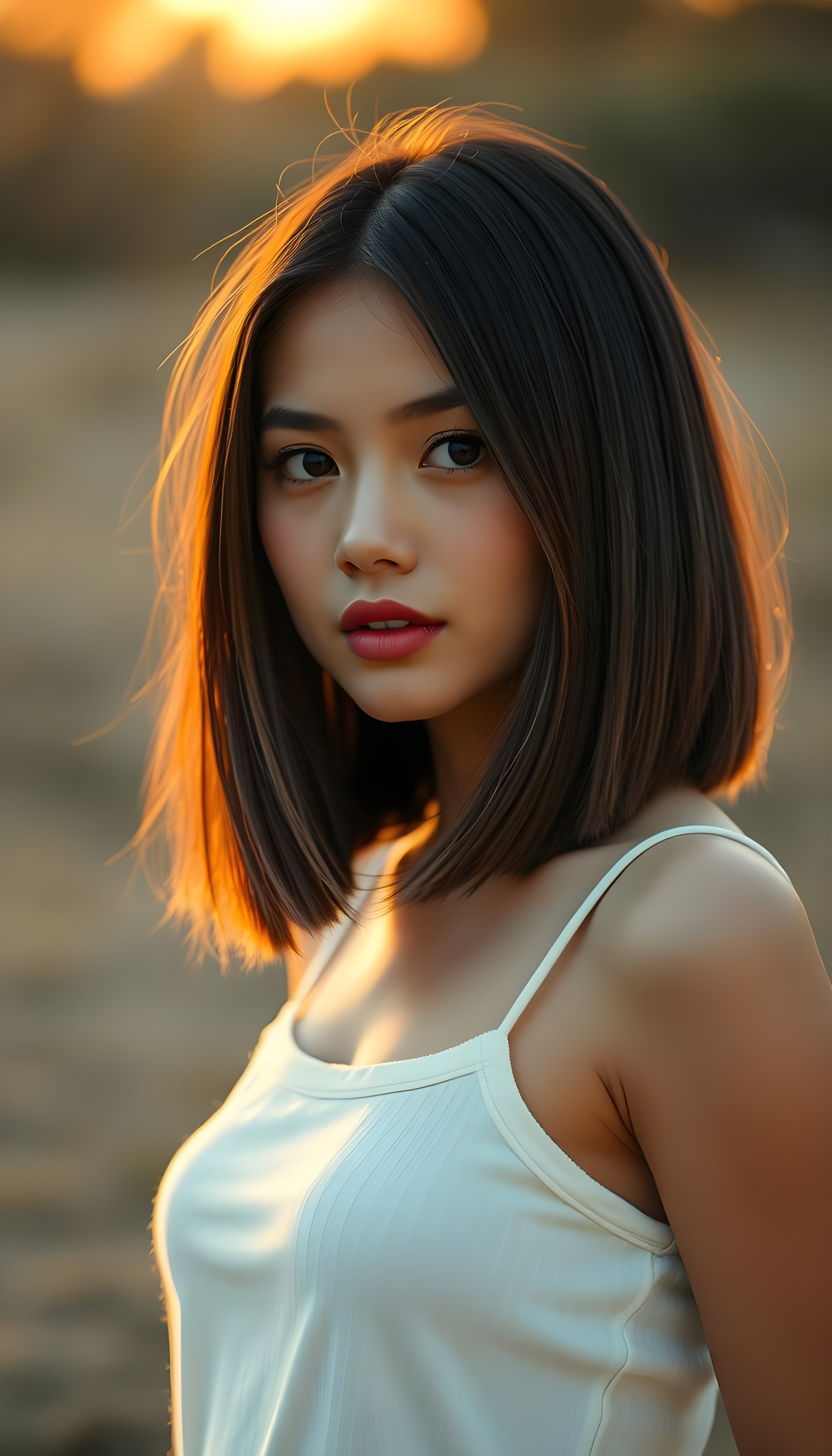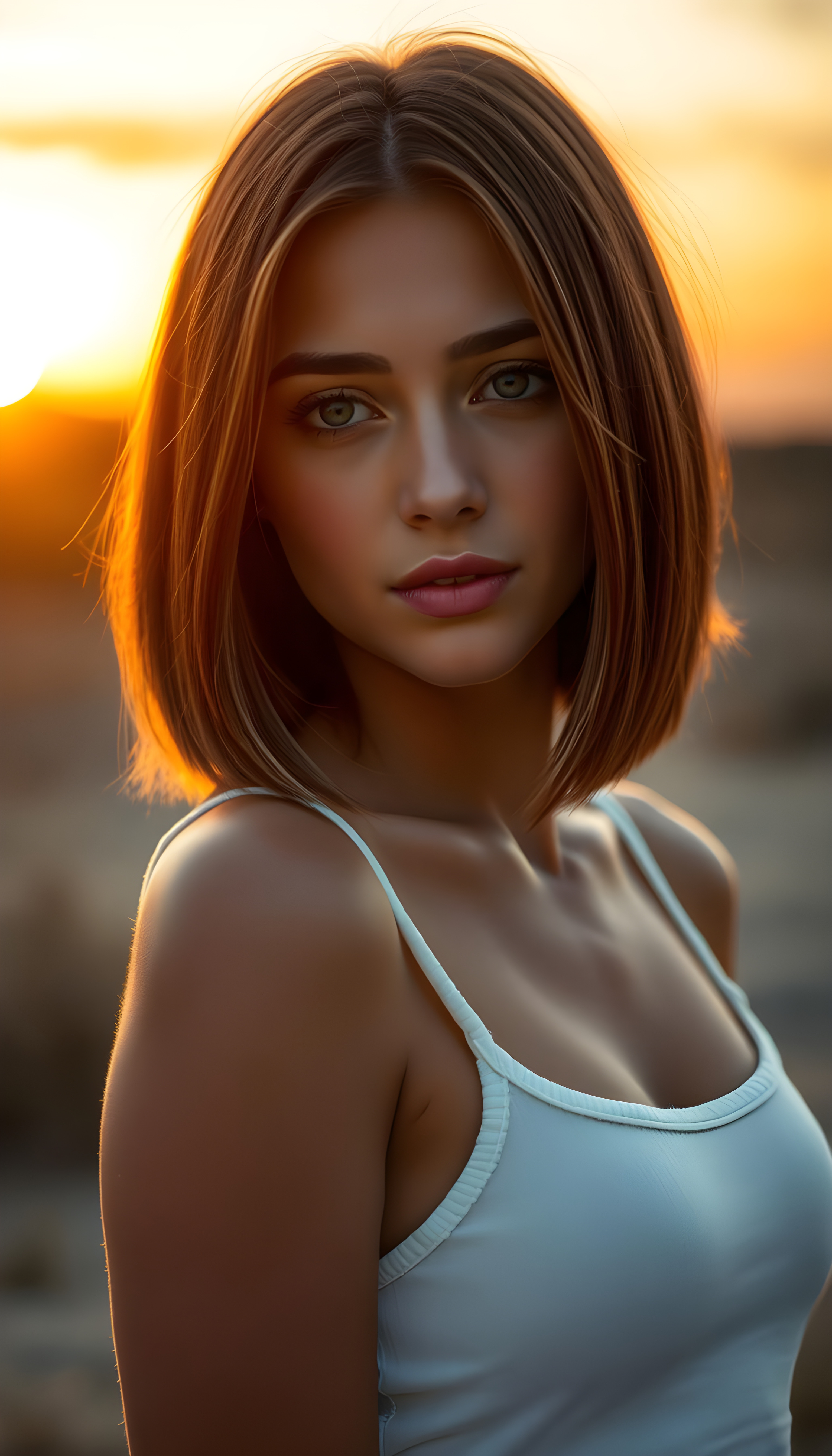 a stunning beautiful girl, straight full open hair, the hair has exact the same length left and right, cute face, bob cut, romantic atmosphere, photo realistic, beautiful sunset, sun kissed skin, white fine plain tank top made of fine wool, seductive glance over the shoulders, full lips.