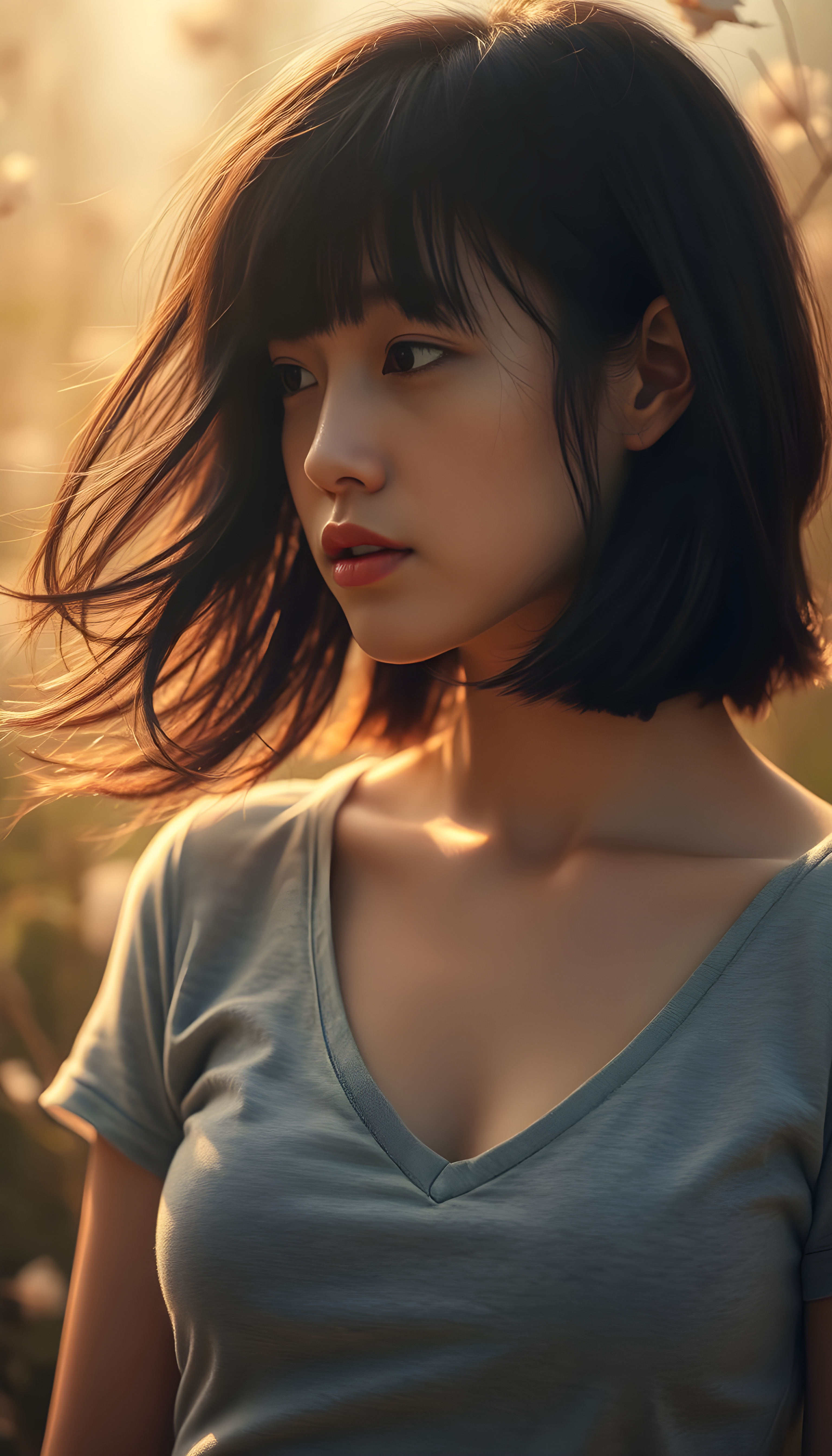 A stunning, ethereal portrait of a beautiful woman with flowing black hair styled in a Korean bob cut with elegant bangs. She wears a light grey cropped t-shirt with a deep V-neck, revealing her graceful collarbone. Her soft skin and perfect curves are accentuated by the warm, golden lighting, casting a gentle glow across her radiant face and kissable lips. The composition is side-profile, capturing the harmony between her natural beauty and the serene, dreamy atmosphere. The background is softly blurred, with hints of lush greenery and delicate flowers, enhancing the tranquil and enchanting ambiance. The artist’s brushstrokes are intricate and detailed, bringing the scene to life with a sense of depth and emotion.
