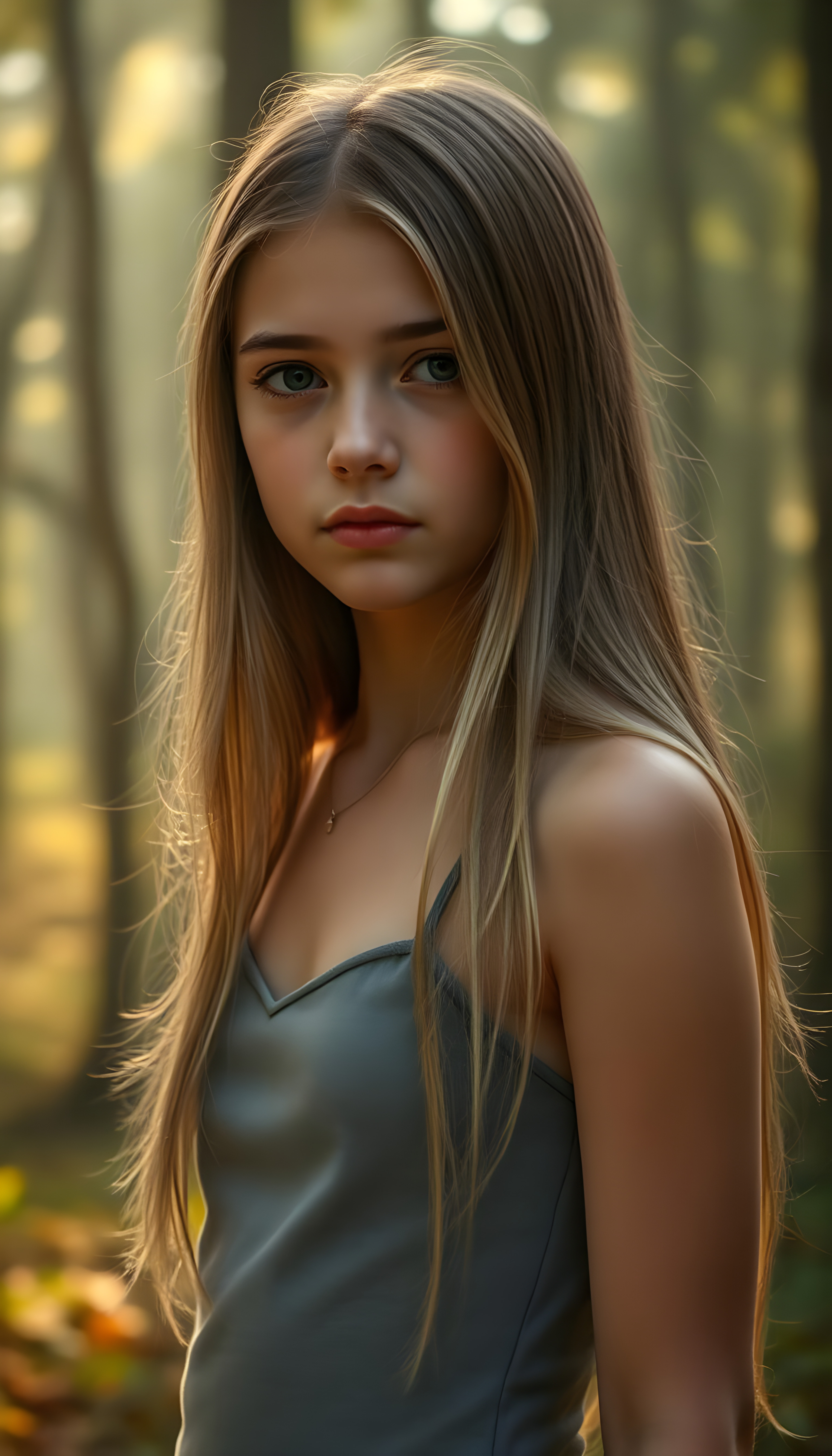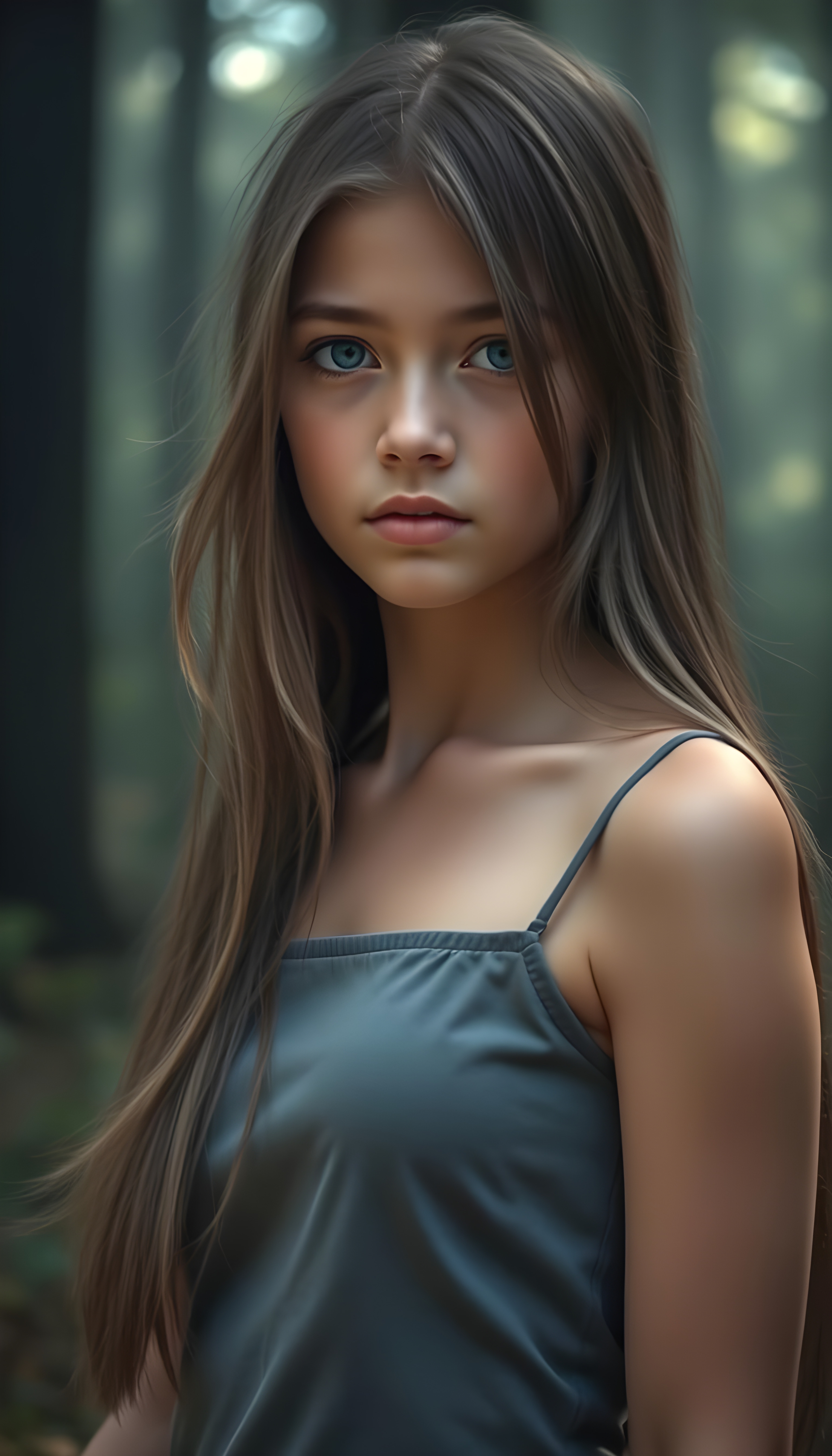 A stunning and beautiful young girl with soft, flowing, straight hair, standing against a serene, misty forest backdrop. She wears a form-fitting, grey camisole vest that highlights her graceful figure. Her hair is detailed with subtle highlights, and her eyes sparkle with an otherworldly charm. The forest is bathed in soft, ethereal light, casting gentle shadows around her. The scene is tranquil, with a hint of magical realism, as if she is part of a serene, fairy-tale-like environment. Her expression is calm and contemplative, adding to the overall serene and enchanting atmosphere.