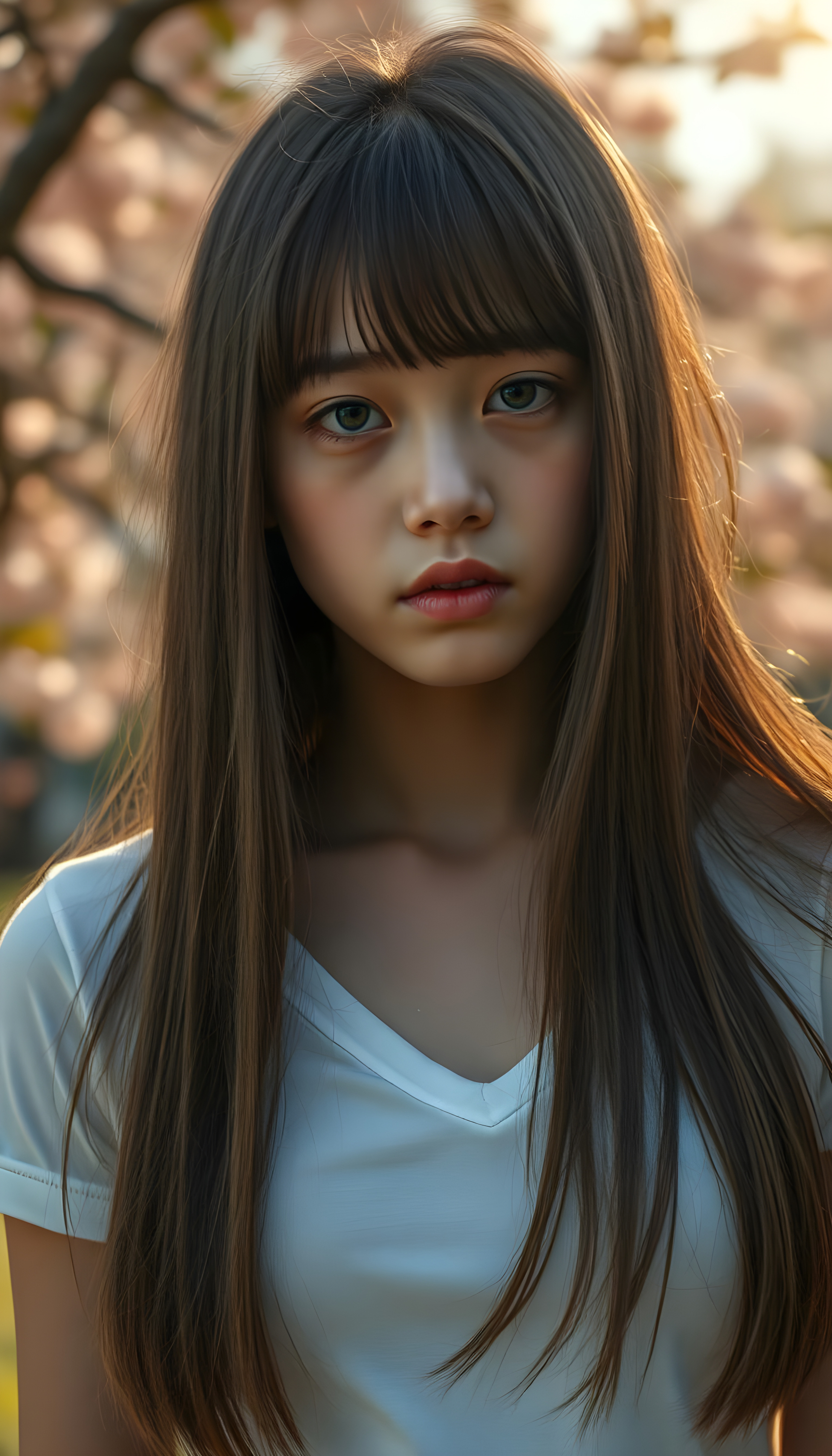 a ((portrait)) of (((cute))) (((elegant))) ((attractive)) (((long, straight hazelnut hair))) ((stunning)) a beautifully realistic, cinematic lights, exotic teen girl, bangs cut, realistic detailed angelic round face, ((realistic detailed hazelnut eye)) looks sadly at the camera, portrait shot, perfect curved body, (wears a super short tight (white t-shirt, deep v-neck) made on thin silk), perfect anatomy, ((all against a sunny green backdrop in a cherry blossom