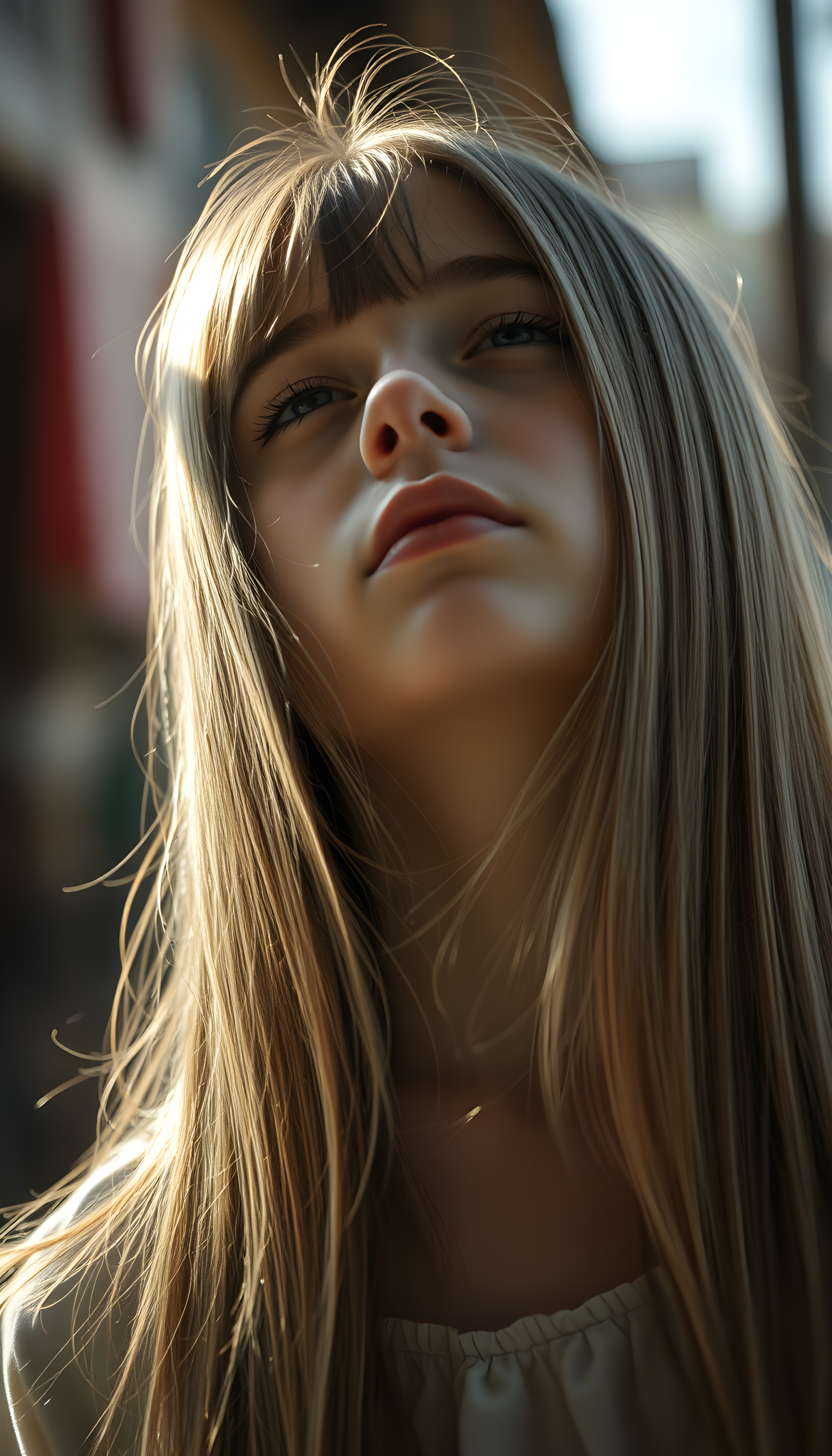 a young girl, looks up, closed eyes, long straight hair falls down to her back, the sun kiss her round face, open mouth